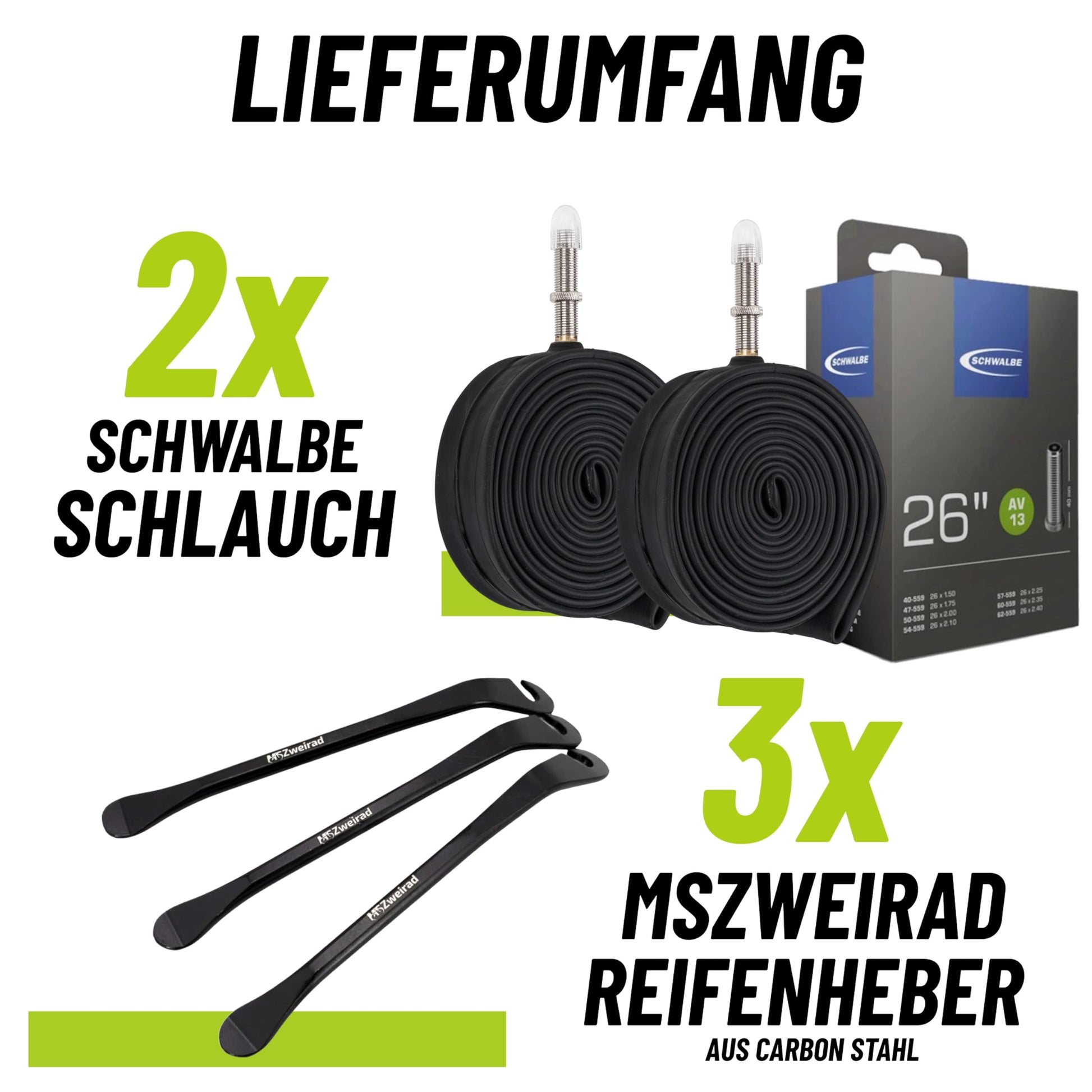 ["Set- The set consists of 2 Schwalbe tubes for bicycles with Dunlop valve including 3 sturdy MSZweirad tire levers.","Dimensions- Tube fits wheel size: 26 inches, ETRTO size: 40/62-559, Valve: AV13 40mm.","ETRTO sizes- Suitable for sizes 40-559, 42-559, 44-559, 47-559, 50-559, 54-559, 57-559, 60-559, 62-559","Size Finder- Not sure which tube fits your tire? Schwalbe's tube filter helps you find the perfect fit for your tire.","Included- The set also includes 3 sturdy tire levers from MSZweirad. These assist with quick and easy tire removal from the rim. Thanks to their smooth surface, our levers are simple and safe to use."]