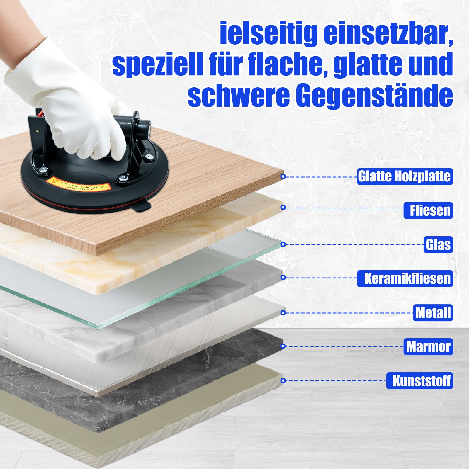 "High-Quality Material: The bottom of this glass suction cup is made of two-layer rubber, the two-layer design makes the airtightness more stable and the suction power more durable. The non-slip, industrial-grade handle is ergonomically designed, comfortable to grip, and makes handling easier. The glass lifter should not be used on rough, porous, curved, watery, or oily surfaces, as these hinder vacuum generation and are not portable.