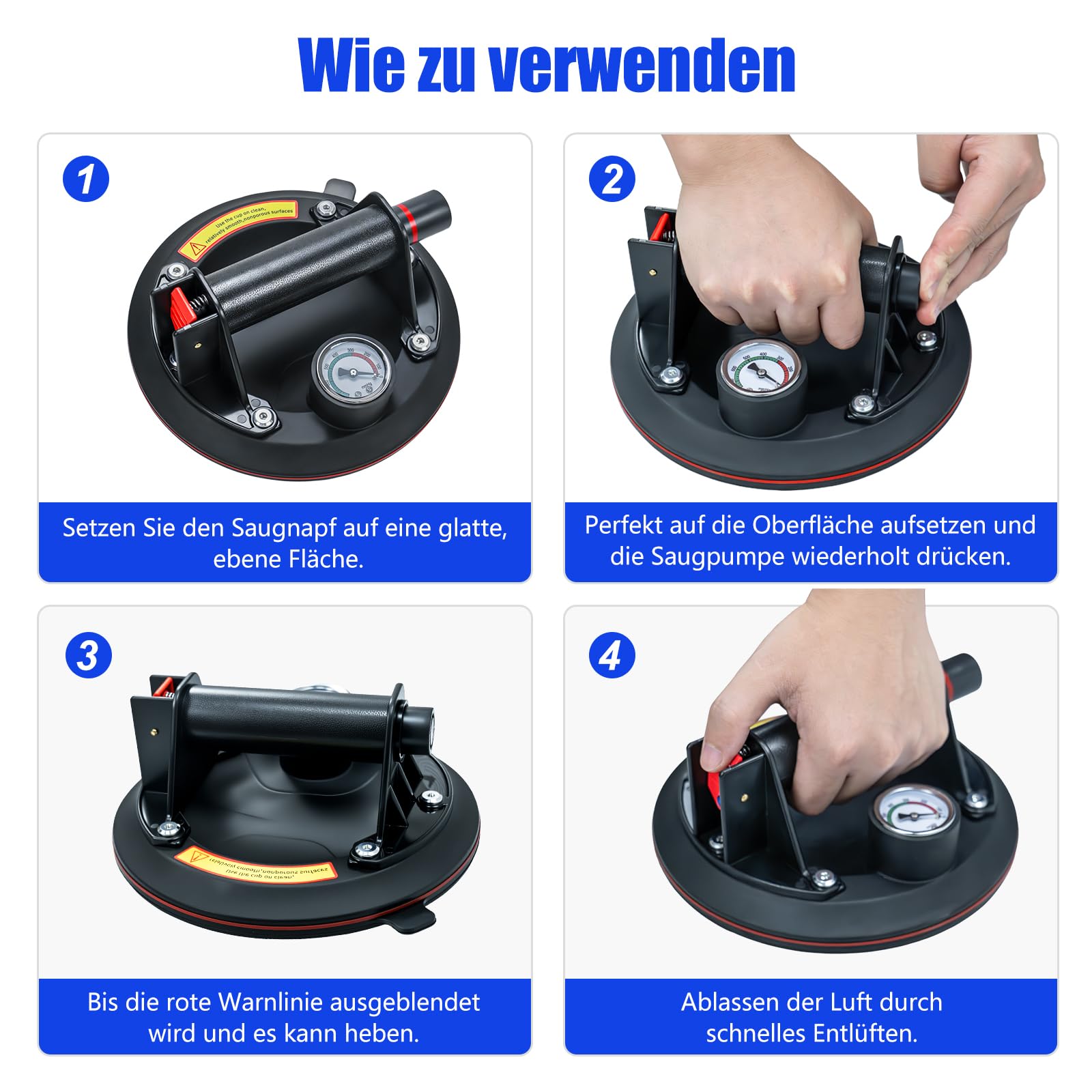 ["Manometer - Safe & Efficient: This vacuum suction cup with a pressure gauge can monitor the pressure in real time and promptly detect vacuum insufficiency. In addition, the red warning line on the vacuum suction cup pump reminds us of the presence of vacuum overflow or overload suction, and you can increase the number of suctions according to the situation for safe handling.