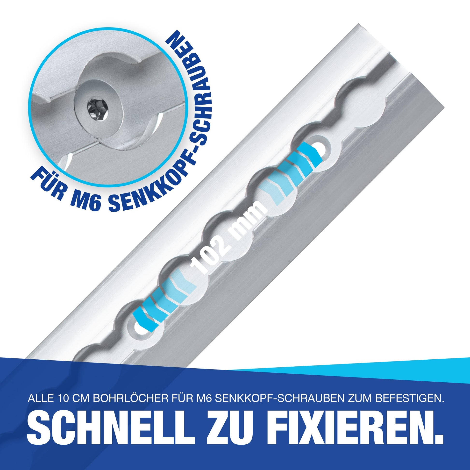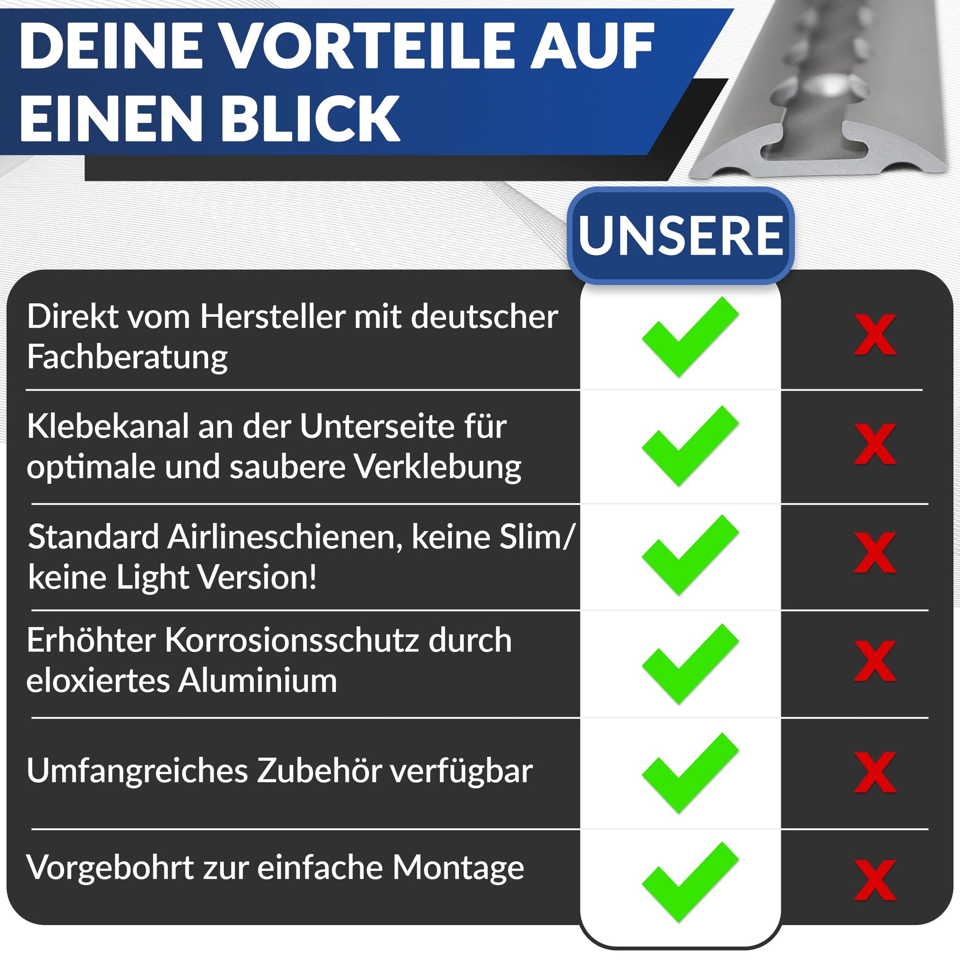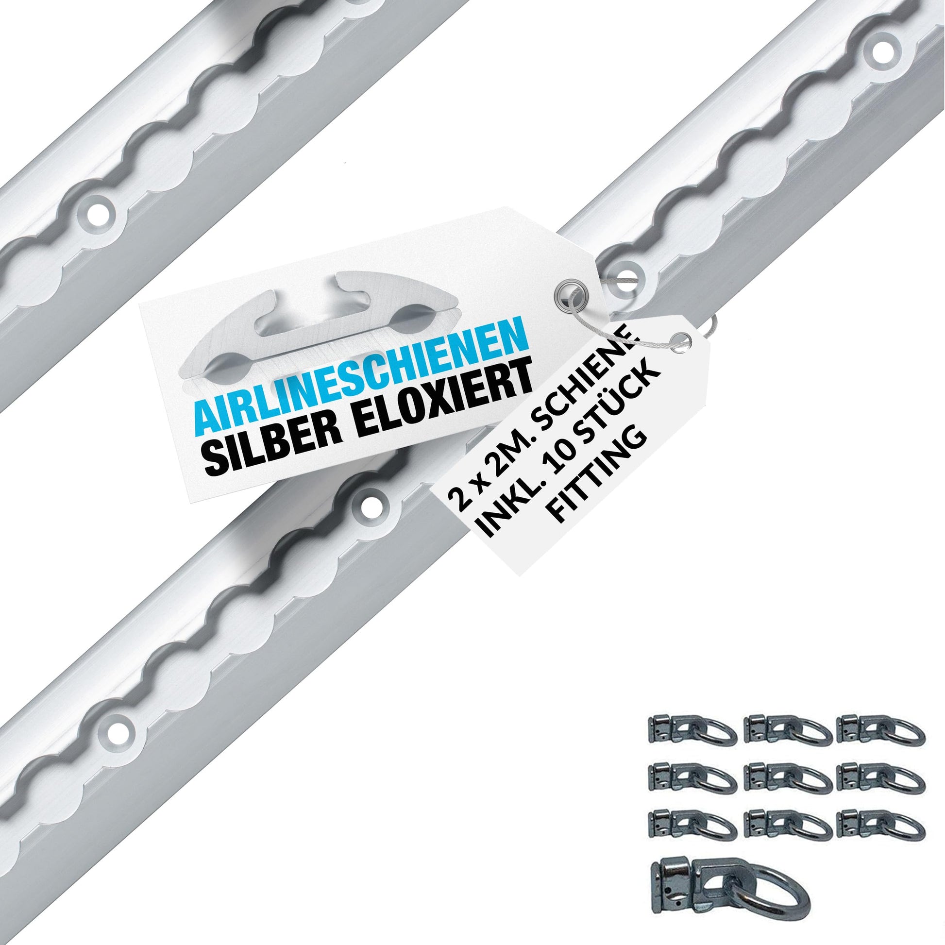 ["SET PRICE: 2 pieces of airline track each 6.56 feet (1975mm) = 13.12 feet + 10 pieces of double fitting galvanized with ring","For packaging reasons, the tracks are delivered in 1975mm","SEMI-CIRCULAR SHAPE: The aluminum airline tracks are designed in a semi-circular shape to ensure efficient cargo securing.","EASY INSTALLATION: The drilled holes in the tie-down rails make it easier to install and secure cargo securing accessories. An adhesive channel on the underside allows for clean bonding.","ANODIZED SURFACE: The tie-down rails are anodized, providing a durable and corrosion-resistant surface for long-term use.","PRE-DRILLED: With holes for secure mounting with M6 countersunk screws","QUALITY: Direct from the manufacturer for a perfect price-performance ratio.","COMPREHENSIVE: Our airline tracks are the foundation for a system that seamlessly adapts to your needs. From sturdy tie-down straps to specialized fittings and T-nuts to flexible tension rods, we offer an extensive range that leaves nothing to be desired. Your cargo, no matter how large, delicate, or heavy, will find secure support thanks to our accessories."]