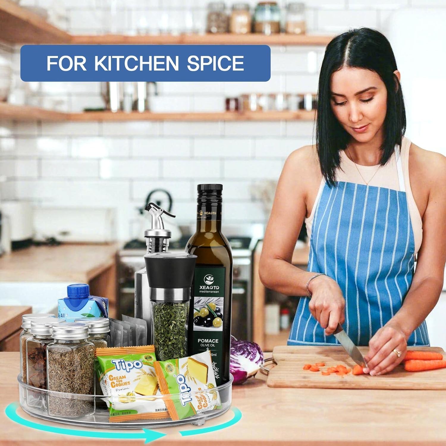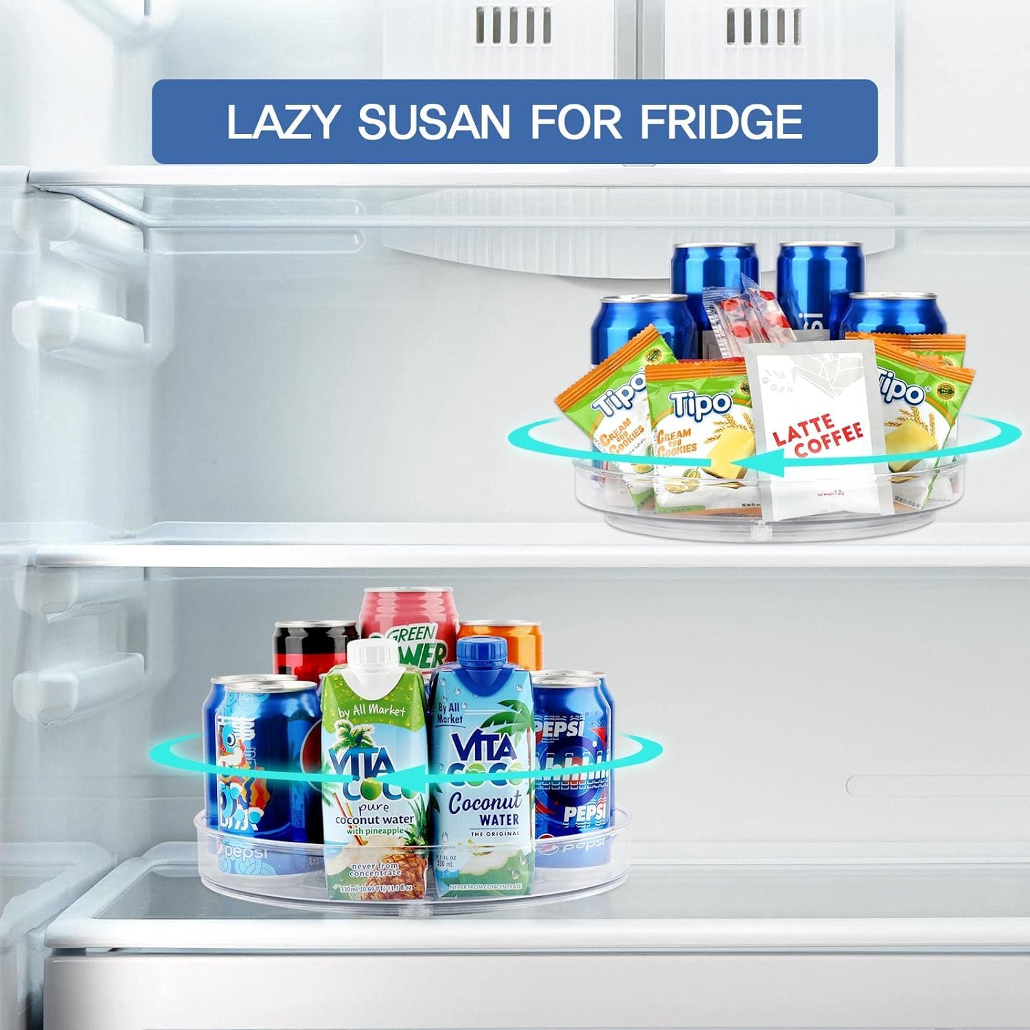 ["Positioned Rotation & Easy Taken】Kitchen Organizer with the bidirectional 360° rotation, items are easy to reach, Beautiful visual appeal, Maximizes storage space, Especially in corners and deep lower cabinets, upper shelves, and cluttered corner countertops, where items can be hard to reach. It eliminates clutter and the problem of never really being able to see what's inside.","【High-Quality Materials】Refrigerator Turntable Organizer PET material, BPA-Free plastic, Non-toxic and tasteless. Each turntable runs on durable, smooth stainless steel ball bearings for smooth gliding every time, and does not wobble, strong load-bearing capacity. Stable, sturdy, free spinning, and quiet.","【Ideal Size】Two different sizes and capacities to meet different daily needs. The small Lazy Susan size is 23.5cm*23.5cm*2.5cm and the large Lazy Susan size is 27cm*27cm*3.5cm. The high edge prevents items from falling off. Fits better in cabinets, pantries, bathrooms, kitchens, refrigerators, etc. These are rotating organizers with large capacity that can help you store a lot of things.","【Clear Plastic & Easy to Clean】The transparent Lazy Susan is highly visible for quick selection and inventory of items. You will always know what you have and then easily find what you want. Easy to clean with mild soapy water. Do not put in the dishwasher.","【Clean & Tidy】: The kitchen spice rack transforms chaos into organization and order. Perfect for spices in the pantry, jars in the fridge, vitamins in the medicine cabinet, shampoos in a closet. Store baby bottles, perfume, cosmetics, skincare products, snacks, drinks, toys, spices, and fruits, etc. With rotating organizers, it makes the space at home well-organized, graceful, and attractive!","【100% Purchase Satisfaction Support】: If you have any problems or suggestions, please contact us without hesitation, our customer service team is ready to help, your satisfaction is what we strive for!"]