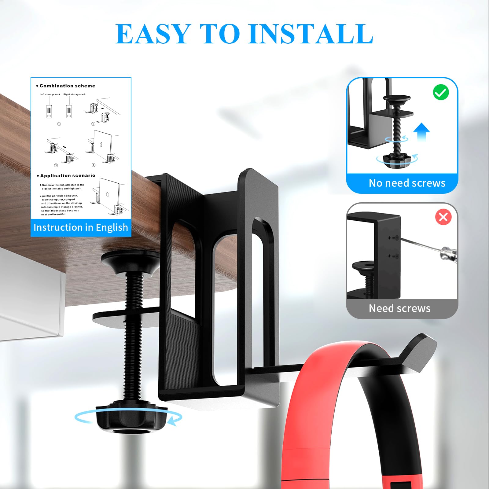 ["Multifunctional Desk Side Storage - Set: You will receive 2 black storage holders. This hanging desk organizer not only solves a lot of clutter on your desk, but also provides ample space to store laptops, headphones, iPads, gamepads, backpacks, books, documents, and more.", "Laptop Stand Desk - Materials: Our laptop organizer is made of high-quality carbon steel. Sturdy and durable, corrosion-resistant, can support up to 11 pounds (5kg).", "No Drilling & Quick Installation - Our Vanzavanzu desk side storage does not require drilling, simply clamp it to your desk and tighten the handle, making it easy to install. You can freely adjust the length and height you need. The included organizer accessories are easy to use and easily removable. Please note: Suitable for table thickness 0.08-1.97IN.", "Side Hanging Laptop: Our stand is hollowed out, which can solve the problem of laptop heat dissipation during charging and prevent potential safety risks. Side laptop holders are universal for most tables. Whether your table is made of wood, glass, or stainless steel, the desk side storage is suitable. Most importantly, your desk will not be damaged.", "Non-slip and Scratch-resistant Design: In addition, the desk side storage laptop features silicone mats to prevent scratches, as well as a padded bottom and equipped cushions to prevent your laptop from slipping and scratching the surface, securing the product safely to a laptop."]