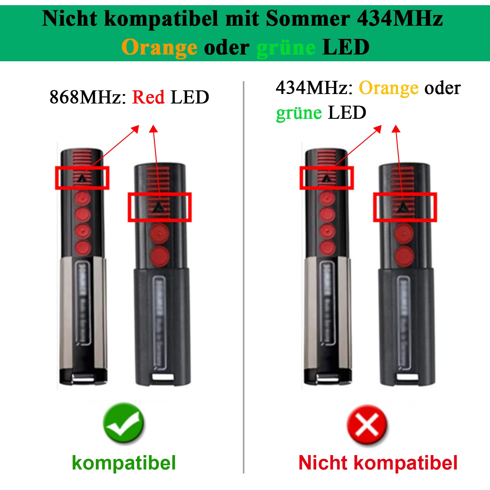 ["Only compatible with Sommer 4020V000 | 4025V000 | 4026V000 | 4031V000 | 4011V000 | 4035V002 (Not for 434MHz series)", "Important Note - If your receiver is SOMMER SOMloq2 868.95MHz, do not buy this product, this remote control is not compatible with SOMMER Pearl, Slider+, Pearl Vibe, Slider Vibe, Pearl Twin, Pearl Twin+, Pearl Status", "Easy to program with your 868.8 MHz garage operator Somloq Rolling Code System", "4 buttons control up to 4 garage door openers","【Important Notes】- 1) If your model is not listed in our compatibility list, this remote control is not compatible with yours. 2) If the LED of the remote control does not light up when pressing the button, please replace the batteries and reprogram the remote control. Sometimes, a weak battery in this remote control can also cause the opener's receiver to not receive the signal."]