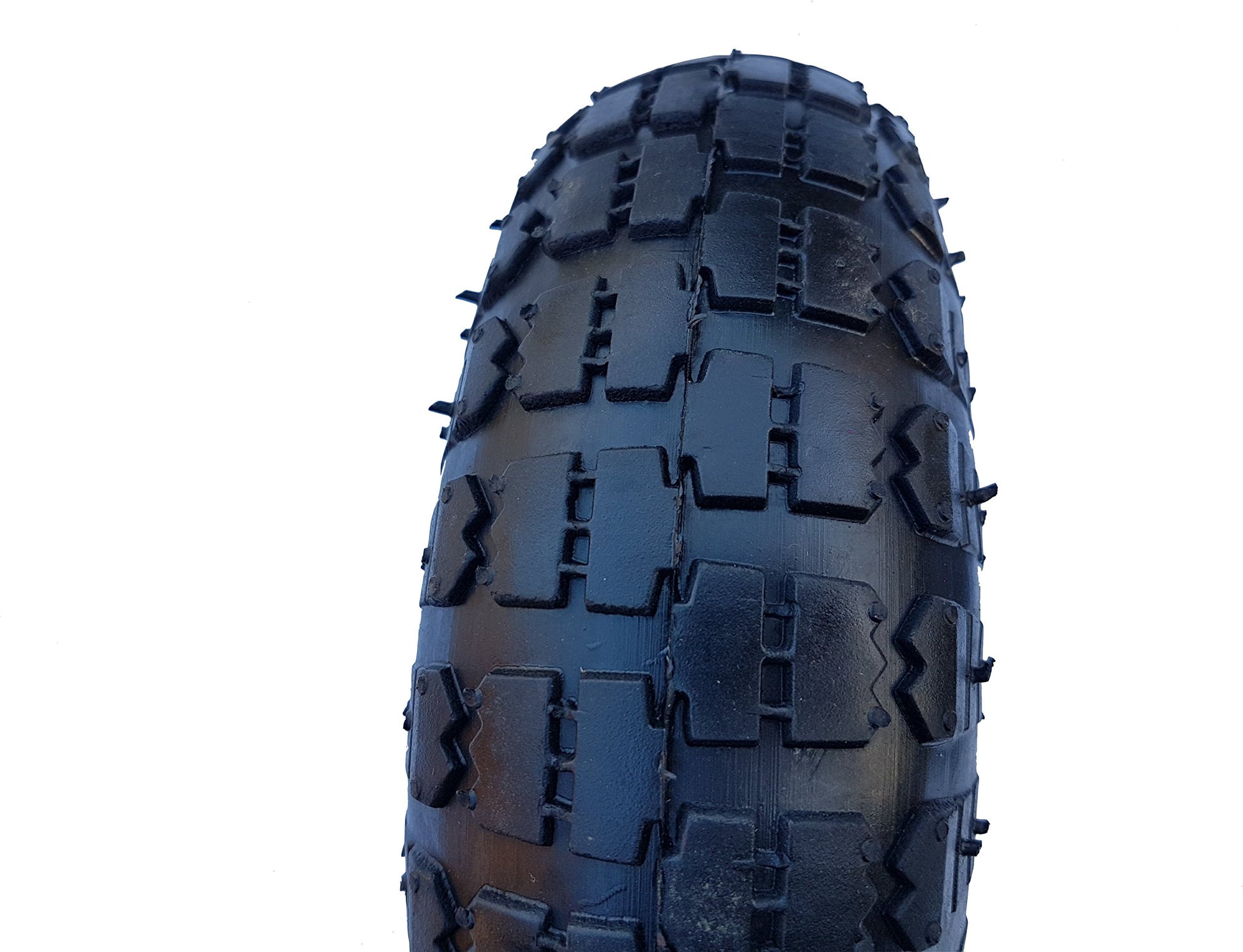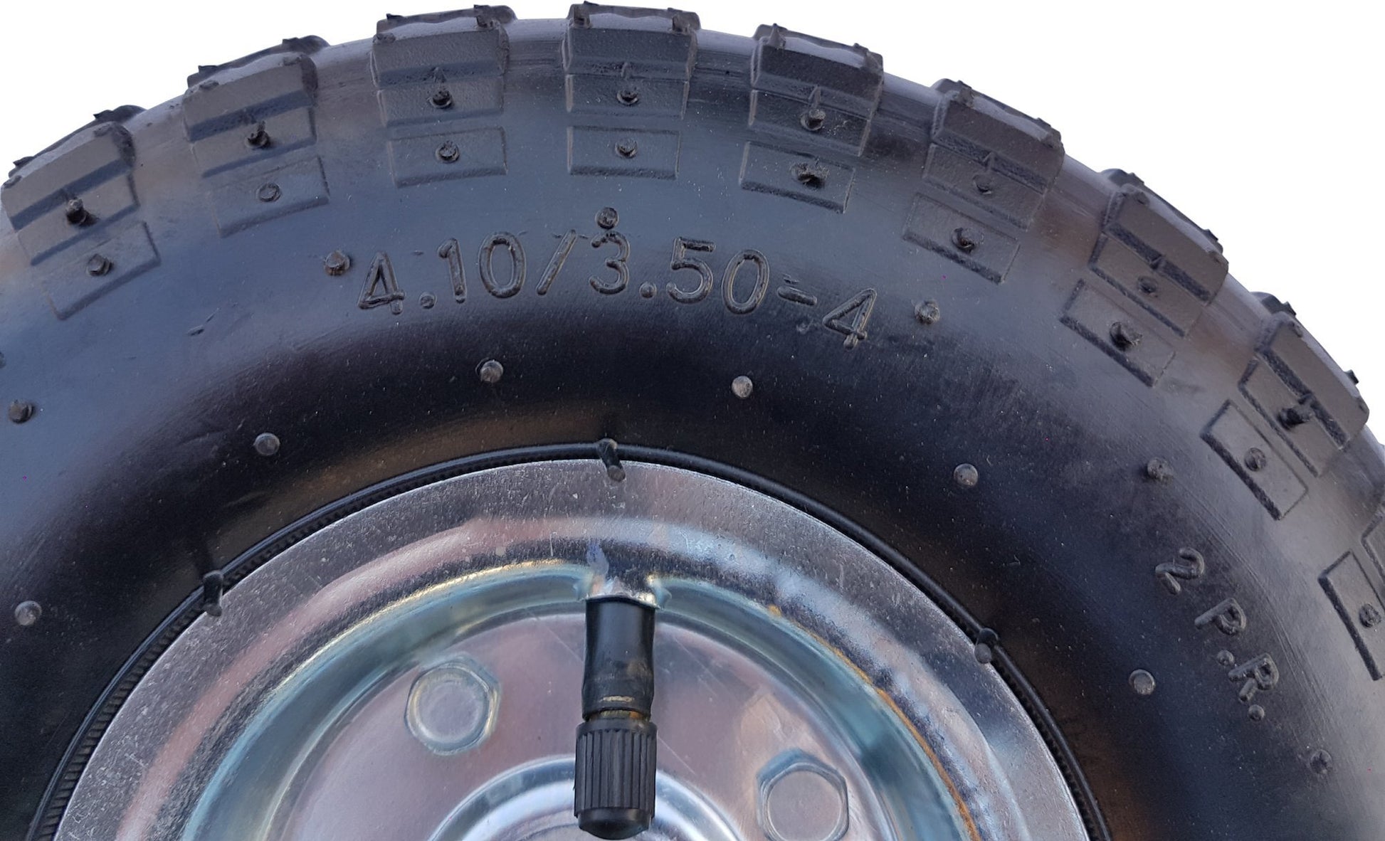 ["Delivery 2 pieces | Pneumatic wheel with max. load capacity: 300 lbs, max. tire pressure: 30 PSI / 2 bar", "Silver painted steel rim detachable by screws, thus easy replacement of inner tube or tire", "Wheel with silver painted steel rim and ball bearings for axles with diameter of 16 mm | Hub length: 55 mm, rim diameter: approx. 120 mm", "Car valve: Therefore, air can be refilled at any gas station", "Spare wheel for handcart, sack barrow, trolley, hand truck Ø 10 inches 4.10/3.5-4"]