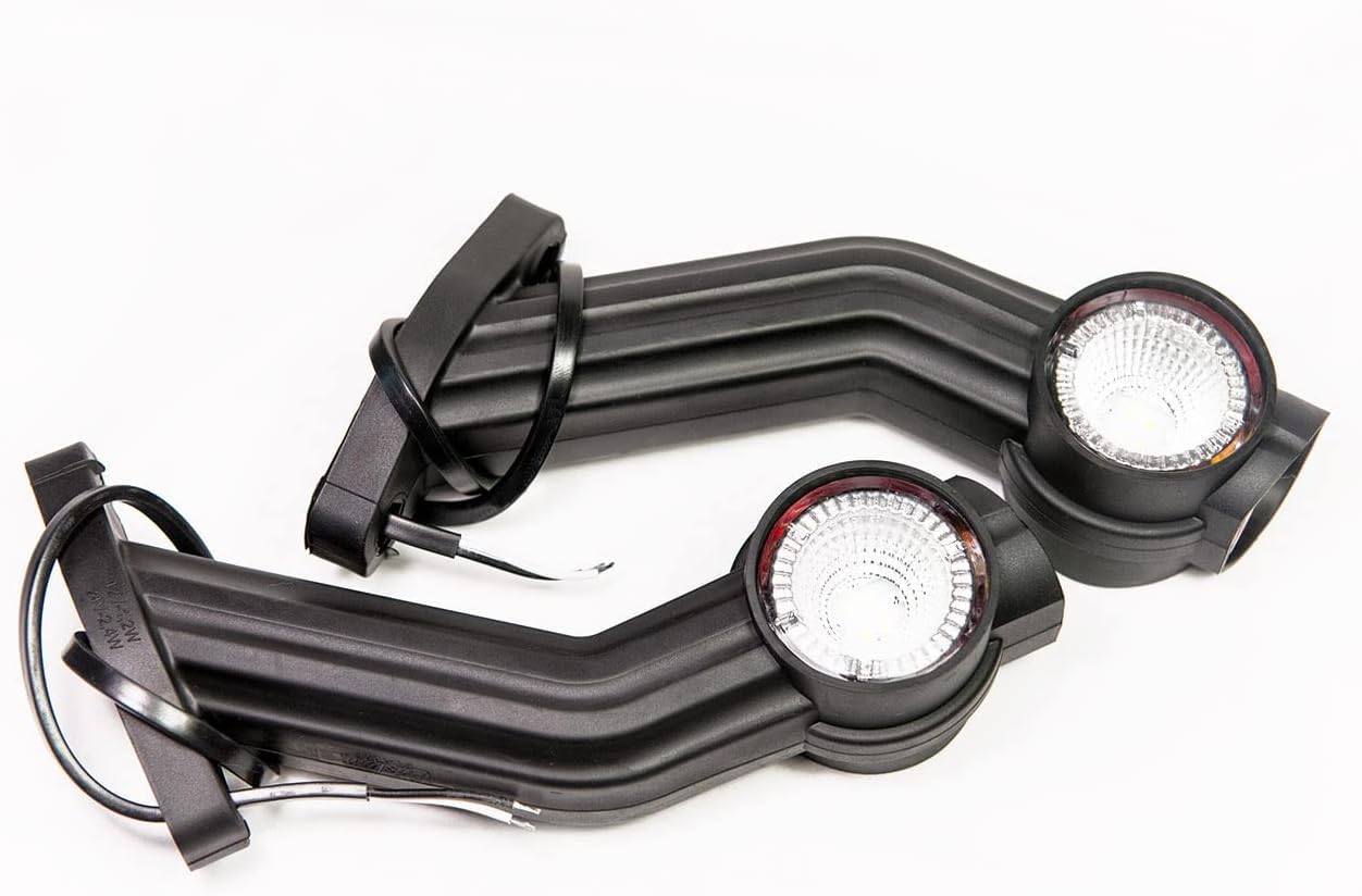 ["2 pieces x LED clearance light (Left + Right), Operating Voltage: 12V - 24V, Pre-wired, Length 190mm, Suitable for Aspöck lamps","Triple side marker light on a slanted, long, left arm","With E-mark - TÜV approved, waterproof. Diveboat. Professional and legal for the US market. Absolute safety signal for users.","3 functions: Red, White and Yellow (Orange). White front position light, red rear position light, orange-yellow side marker light, complying with the latest European traffic safety standard.","Clearance light side light for trailers, semitrailers, caravans, motorhomes, trucks."]