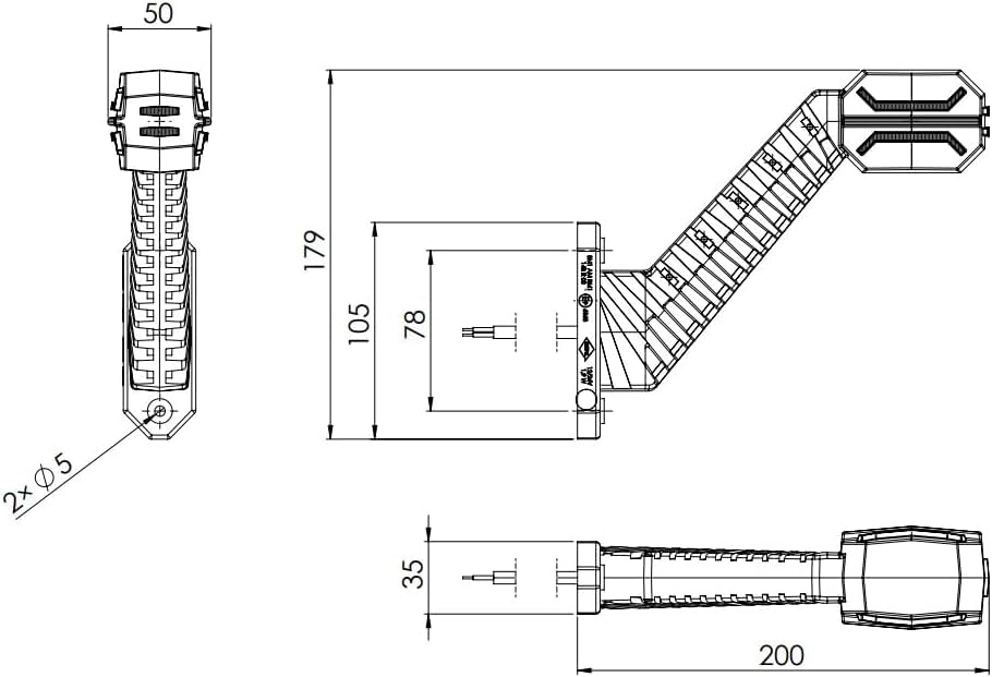 "The light functions: - Rear position light (red light color) - 6 diodes - Front position light (white light color) - 6 diodes - Side marker light (orange light color) - 4 diodes. Power supply - 12/24 V, rated power 1.9 W, cable routing 2×0.75 mm2; cable length 0.5 m. The light is completely hermetic (complies with protection class IP68) and the operating temperature range is from -30 °C to +50 °C. The rubber construction makes the lamp flexible and very durable. Perfect for trailers, semitrailers, caravans, trucks. Dimensions: Length 200 mm, height 179 mm, thickness 50 mm, bolt spacing 78 mm."