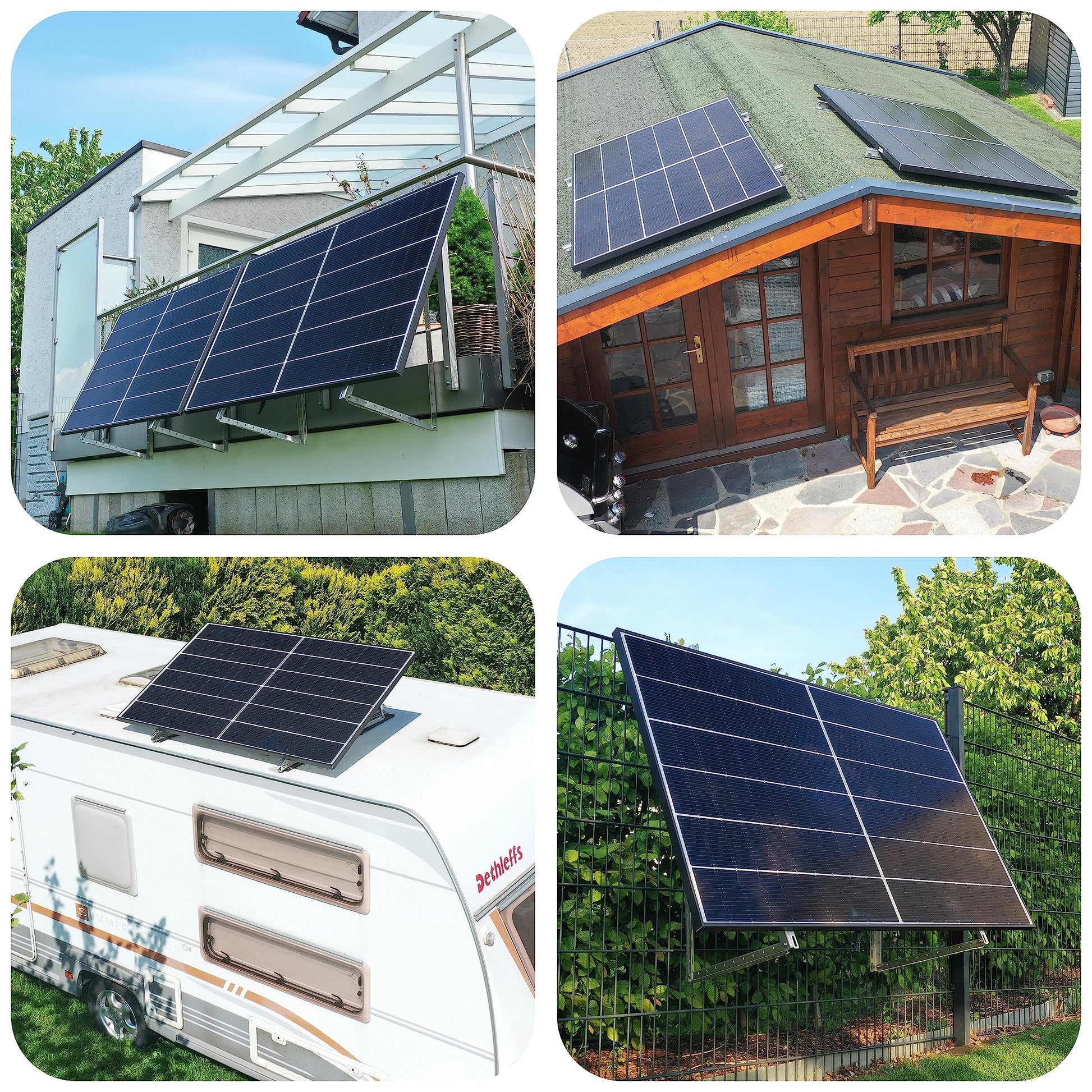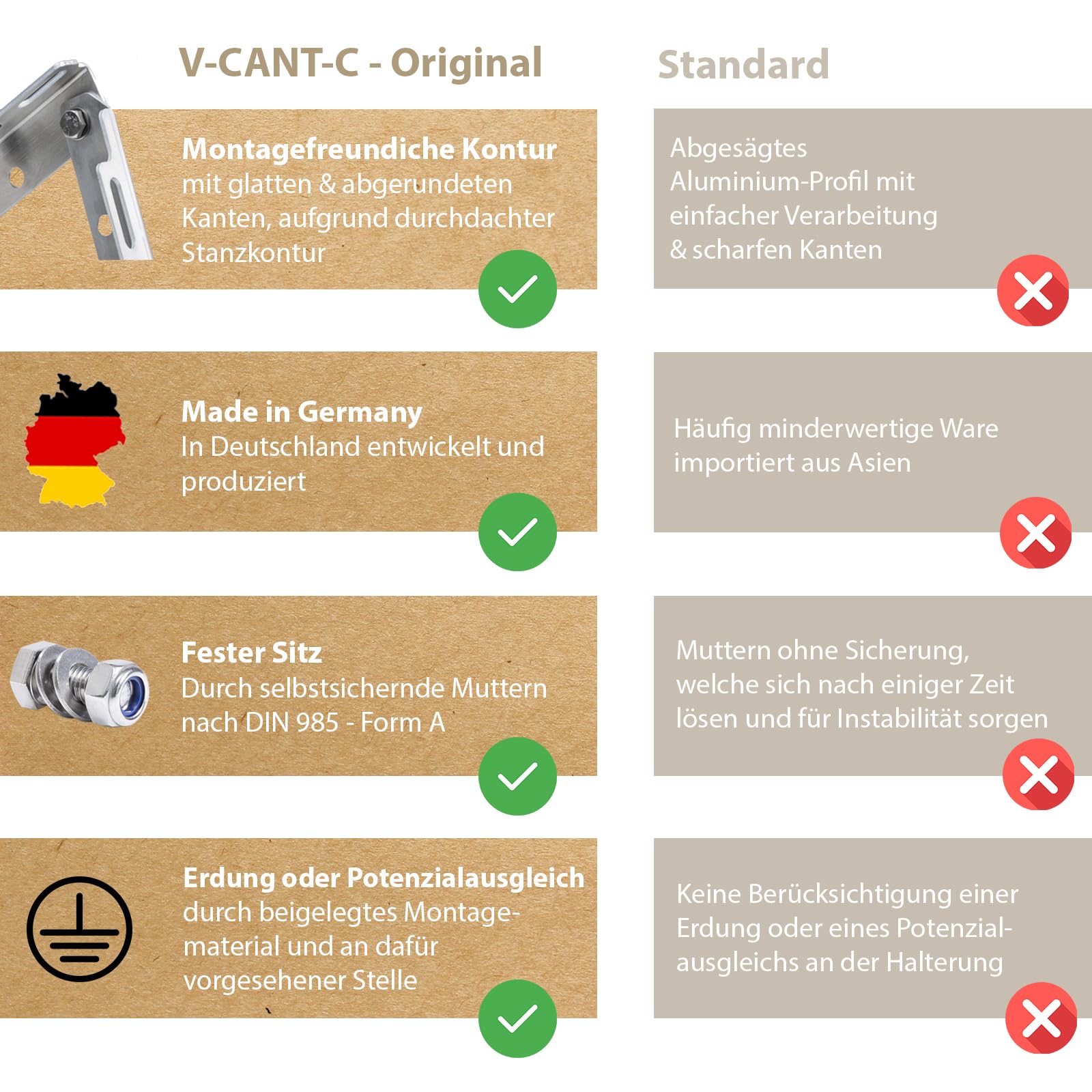 ["The bracket for solar panels is made of a sturdy PV mounting system and stands out for its exceptional load capacity with a material thickness of 2.5 mm. The balcony power plant mounting is very weather-resistant due to the aluminum material, with a relatively low weight of 1.6 kilograms. In addition, the entire mounting set for balcony power plants is supplemented by resilient stainless steel screws, nuts, and washers.","【TECHNICALLY WELL-THOUGHT-OUT】The PV module bracket is adjustable due to the optimal number of hole combinations for various sun angles from 0° - 90° and can therefore deliver maximum yield. The roof mountings for solar panels are suitable for mounting all common solar modules. With the solar bracket, modules up to 114.0 cm and 600 W can be mounted. The solar module attachment is very easy to install and safe to work with due to the rounded edges.","【SOAK UP THE SUN WITH THE RIGHT SETTING】Install the solar panel bracket near your residential building and benefit from tax-free purchases this year! Whether as a balcony power plant holder, flat roof solar module holder, wall mount for PV modules, or balcony power plant railing holder - the solar module bracket is versatile. Become a bit more autonomous and sustainable by using the V-CANT-C mounting for balcony power plants.","【MADE IN GERMANY】The balcony power plant mounting was developed and produced with great passion by engineers in Germany. After production, each PV module mounting is individually hand-checked and packaged. Customers nationwide trust the product quality for the mounting system for solar modules 100%. By purchasing a solar module attachment, you are supporting fair production conditions that are characterized by sustainable quality from V-CANT-C.","【QUALITY COMPLETE PACKAGE】The solar panel holder consists of two mounting triangles and is delivered with a complete mounting set for solar modules. The balcony power plant mounting set includes stainless steel screws, washers, and self-locking nuts for a secure fit. Additionally, you can ground your system with the included toothed washer at the designated location. The mounting + balcony power plant is ready for use within minutes due to the quick installation."]