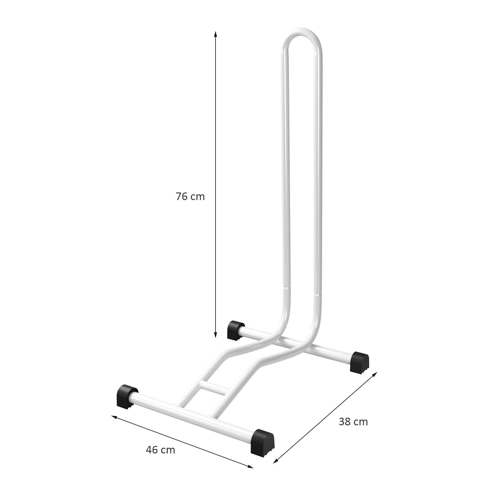 ["UNIVERSAL - With the WELLGRO bike stand, you can store all common types of bikes with tires up to 29´´ and 6.5 cm width in a space-saving way, simply slide in and out again.","NON-SLIP AND PROTECTIVE - Thanks to the rubberized feet, the bike stands securely. Annoying slipping and scratches on valuable floors are finally a thing of the past.","COLOR SELECTION - We offer all bike stands in different colors. This way, you can stylishly and quickly create space in your garage, hobby room, or basement.","EASY ASSEMBLY - The bike stand is quickly ready for use without complicated assembly thanks to the simple yet sophisticated plug-in system and provides a secure hold.","FAQ's - Our bike stands made of powder-coated steel are extremely robust and durable. Each bike holder has dimensions of approx. 46 x 38 x 76 cm (LxWxH)."]