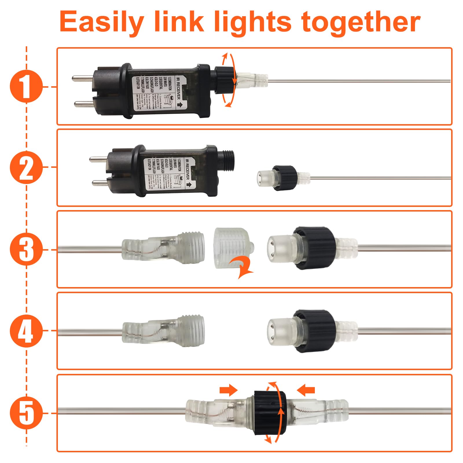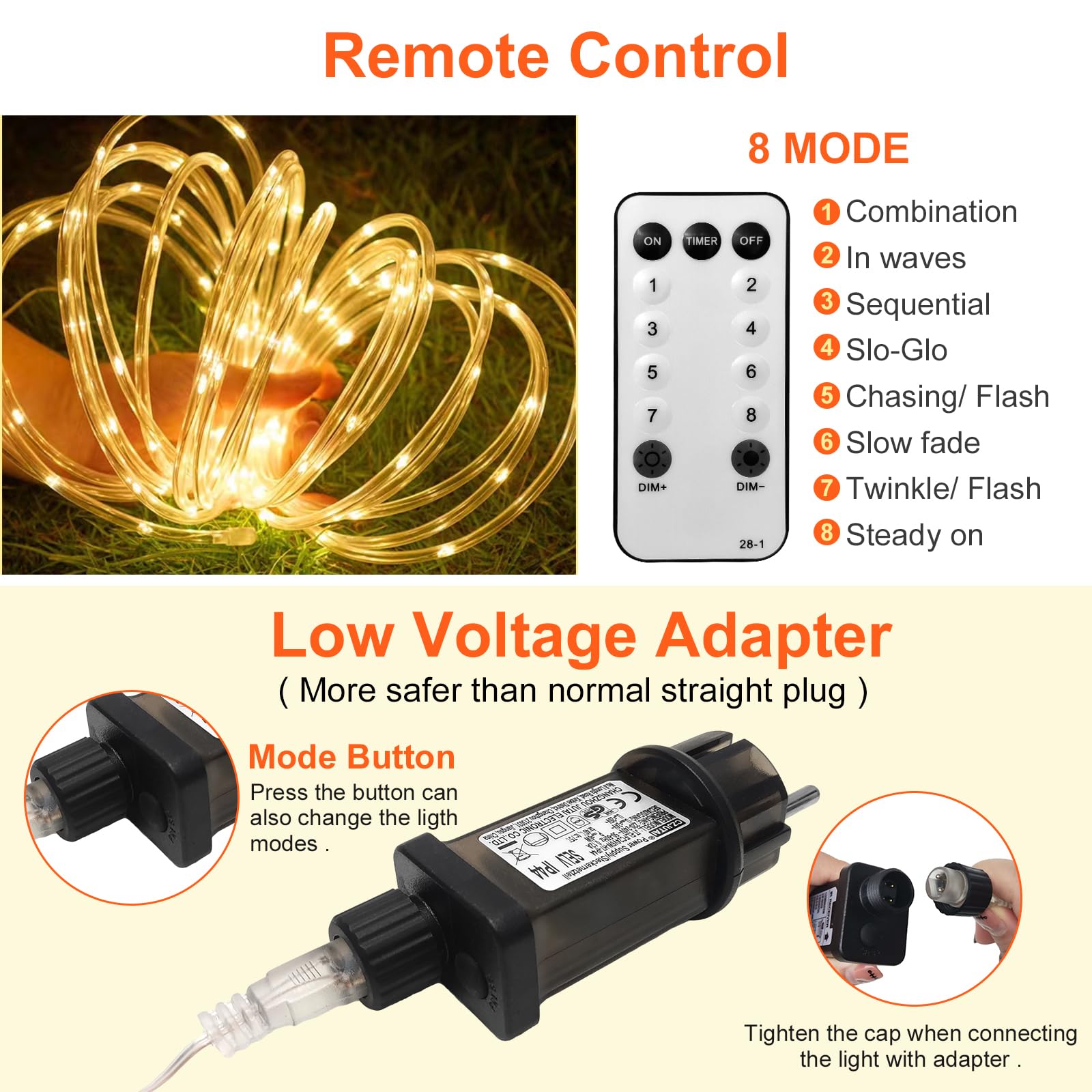 ["23m LED Rope Light】23 meters (20 meters rope + 3 meters power cable). LED quantity: 200 LEDs. LED string lights are very flexible. It can be bent into any shape to meet your various decoration needs. More importantly, the soft plastic hose effectively prevents the light string from tangling.","【Remote Control and Timer Function】Our LED rope light comes with 2 remote controls with on/off button, timer, adjustable brightness mode, 8 light modes. Press the "Timer" button once, the light will be on for 6 hours and off for 18 hours. (Note: 1. When using the remote control, please aim at the plug! 2. The remote control should be aimed at the receiver within 5M range).","【Widely Used String Lights】LED rope light for outdoor Protected by a clear, flexible PVC tube on the outside, the thin and flexible rope can be bent in all directions to wrap almost anything, allowing you to create the shape you desire. Perfect for all kinds of shapes and Christmas decorations. It is also widely used in pools, trampolines, weddings, parties, wrapped around trees, pathways, and more.","【Waterproof】The plug is IP44 waterproof and the rope light is IP65 waterproof. With the protection of a heat-resistant, cold-resistant tube, it is waterproof and resistant to all weather conditions, including heavy rain and snow.","【Hassle-free Customer Service】The package includes 1 piece of 200LED Fairy Tube String Lights, 2 pieces of remote control. These decorative string lights will make your home and garden colorful and romantic. If you have any further questions, please contact us immediately. We promise to solve the problem within 12 hours."]