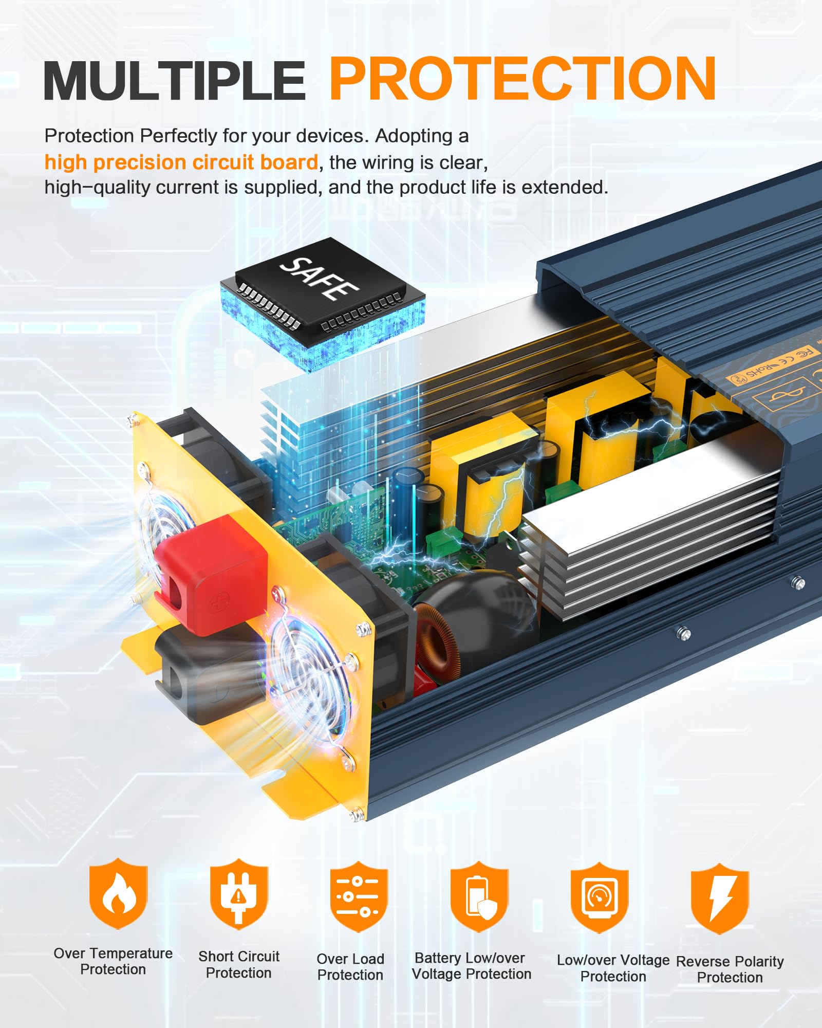 【FUSE AND COOLING FAN PROTECTION】 Vehicle inverters have a built-in fuse that protects against short circuit currents and reverse polarity of the battery terminals, ensuring that your battery is not wasted by overvoltage and overload. Built-in dual intelligent fans can automatically turn on when the inverter heats up after idling or turning on, to avoid safety accidents due to overheating.