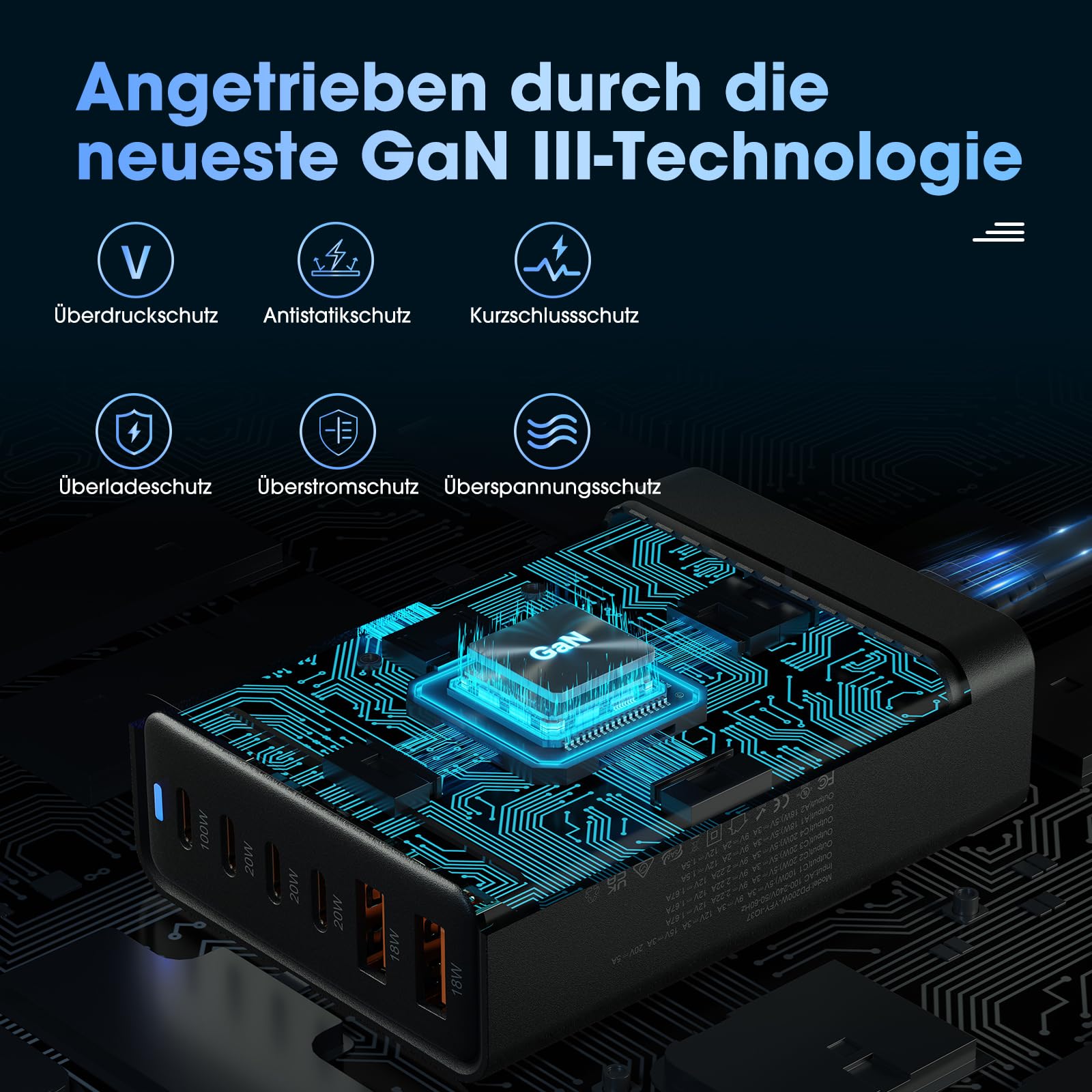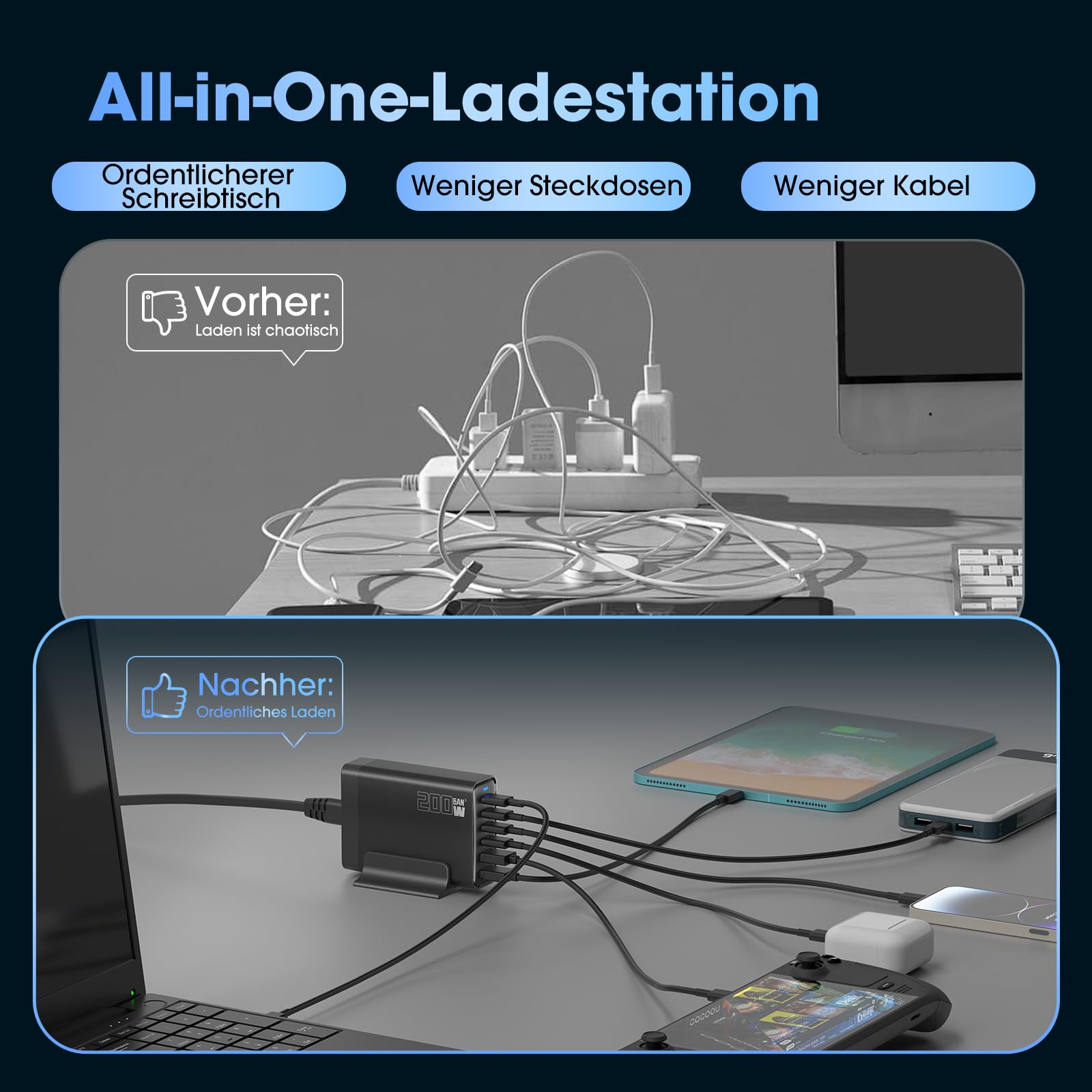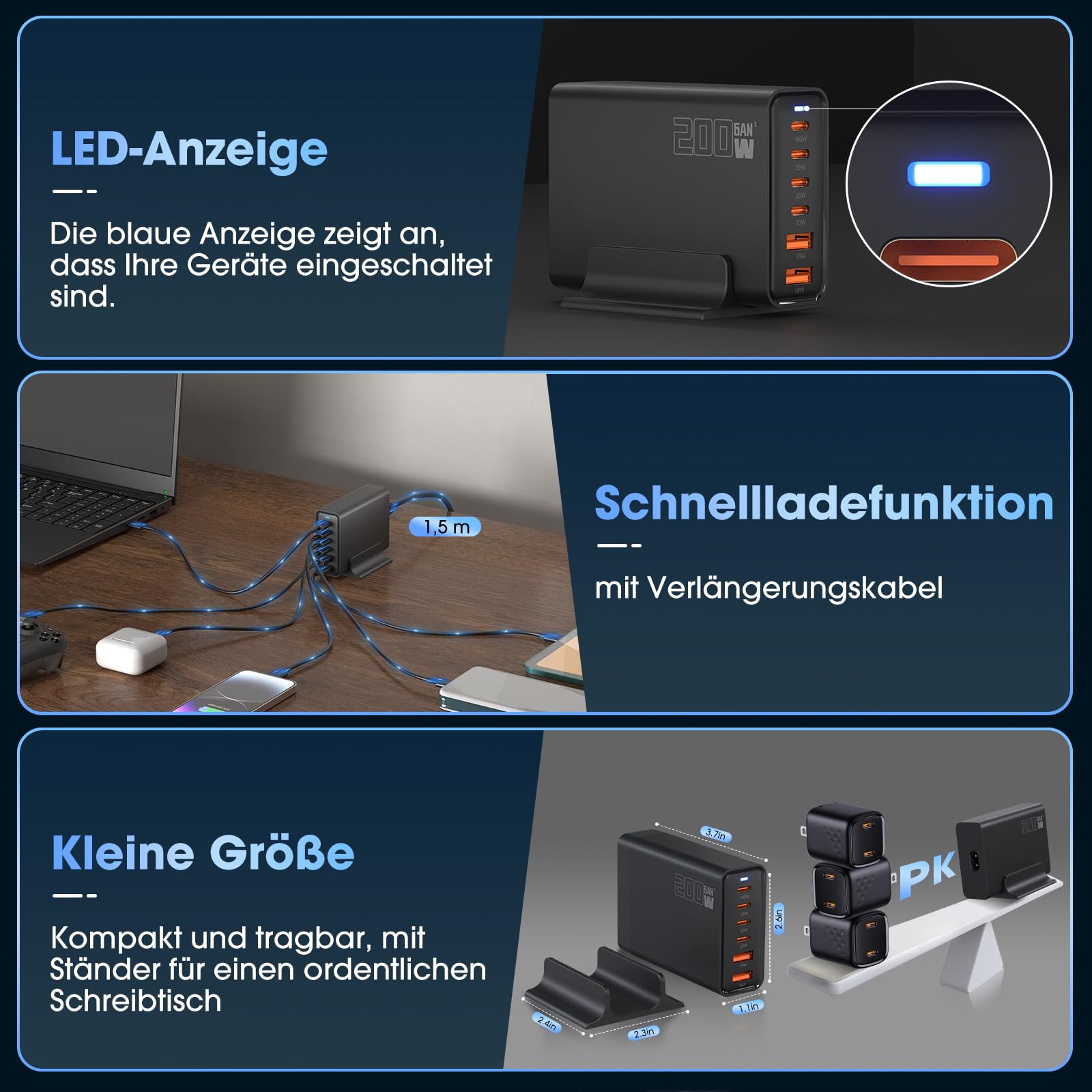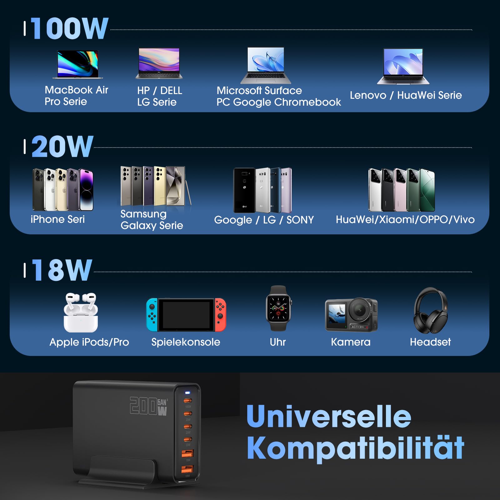 ["【Maximales 100-W-Schnellladen】 Dieses 200-W-USB-C-Schnellladegerät verfügt über einen maximalen 100-W-Ladeanschluss und lädt Ihr MacBook Pro in 30 Minuten von 16 auf 50 % oder in nur 15 Minuten auf 20–25 % auf. Sie erhalten in wenigen Minuten und ohne lange Wartezeiten ausreichend Strom für eine kurze Nutzung Ihres Laptops. Der Ladevorgang ist 30 % schneller als bei 65 W. Ideal zum schnellen Aufladen Ihres Laptops, wenn Sie dringend unterwegs sind.","【6-in-1-Multiport-200-W-Ladestation】 Diese multifunktionale 200-W-USB-C-Ladestation lädt bis zu sechs Geräte gleichzeitig. Kompatibel mit MacBook Pro/Air, HP, Lenovo, Microsoft Surface, Dell und anderen Laptops, iPhone, Samsung Galaxy, iPad, AirPods, Steam Deck-Spielkonsolen, Smartwatches, Smartkameras, kabellosen Kopfhörern usw. Der 20-W-Schnellladeanschluss lädt Ihr Mobiltelefon schnell auf. Hinweis: Bei gleichzeitiger Nutzung des 100-W-Anschlusses und anderer USB-Anschlüsse reduziert sich die Leistung auf 65 W. Während Sie einen Laptop laden, können Sie auch ein Mobiltelefon schnell aufladen.","【Leichtes, tragbares Reiseladegerät】 Dieses USB-C-Ladegerät hat ein kompaktes Design mit den Maßen 3,7 x 2,6 x 1,2 Zoll und einem Gewicht von nur 7,3 Unzen. Es lässt sich problemlos in Taschen und Koffern verstauen, spart Platz und vermeidet das Mitführen mehrerer platzraubender Computer- und Handyladegeräte. Der mitgelieferte abnehmbare 5-Fuß-Ladekabelstecker ermöglicht flexibles Laden aus der Ferne, während die mitgelieferte abnehmbare U-förmige Anti-Rutsch-Halterung für Stabilität und Sicherheit sorgt. Es eignet sich sowohl für unterwegs als auch für den Heimgebrauch mit mehreren Geräten und reduziert so die Belegung von Steckdosen.","【Hochmodernes GaN-III-Ladegerät】 – Dieses USB-C-Ladegerät ist mit dem neuesten GaN-III-Chipsatz ausgestattet, der die Energie je nach Gerät intelligent auf alle Anschlüsse verteilt und so die Ladeeffizienz maximiert. Dank fortschrittlicher Wärmeableitungstechnologie und mehreren Sicherheitsfunktionen (Überladung, Überhitzung, Kurzschluss usw.) lädt es alle Ihre Geräte schnell, zuverlässig und sicher. Ob auf dem Schreibtisch oder als Dockingstation – dieses GaN charger läuft schneller, leitet die Wärme besser ab und ist effizienter als herkömmliche Ladegeräte. Es lädt Ihre Geräte sicher über Nacht.","【Weit verbreitet】 Diese 6-in-1 USB C netzteil wird häufig dort eingesetzt, wo mehrere Geräte wie Laptops und Mobiltelefone gleichzeitig geladen werden müssen, z. B. in Büros, Homeoffices, Studios, auf Reisen, zu Hause usw. Dieses Schnellladegerät ist mit 100-W-, 96-W-, 65-W- und 45-W-Ladegeräten kompatibel. Es ist ein unverzichtbares Produkt für Zuhause und Büro und auch ein tolles Geschenk für Profis wie Elektronik-Enthusiasten, Videomacher, Redakteure, Grafikdesigner, Programmierer usw."]