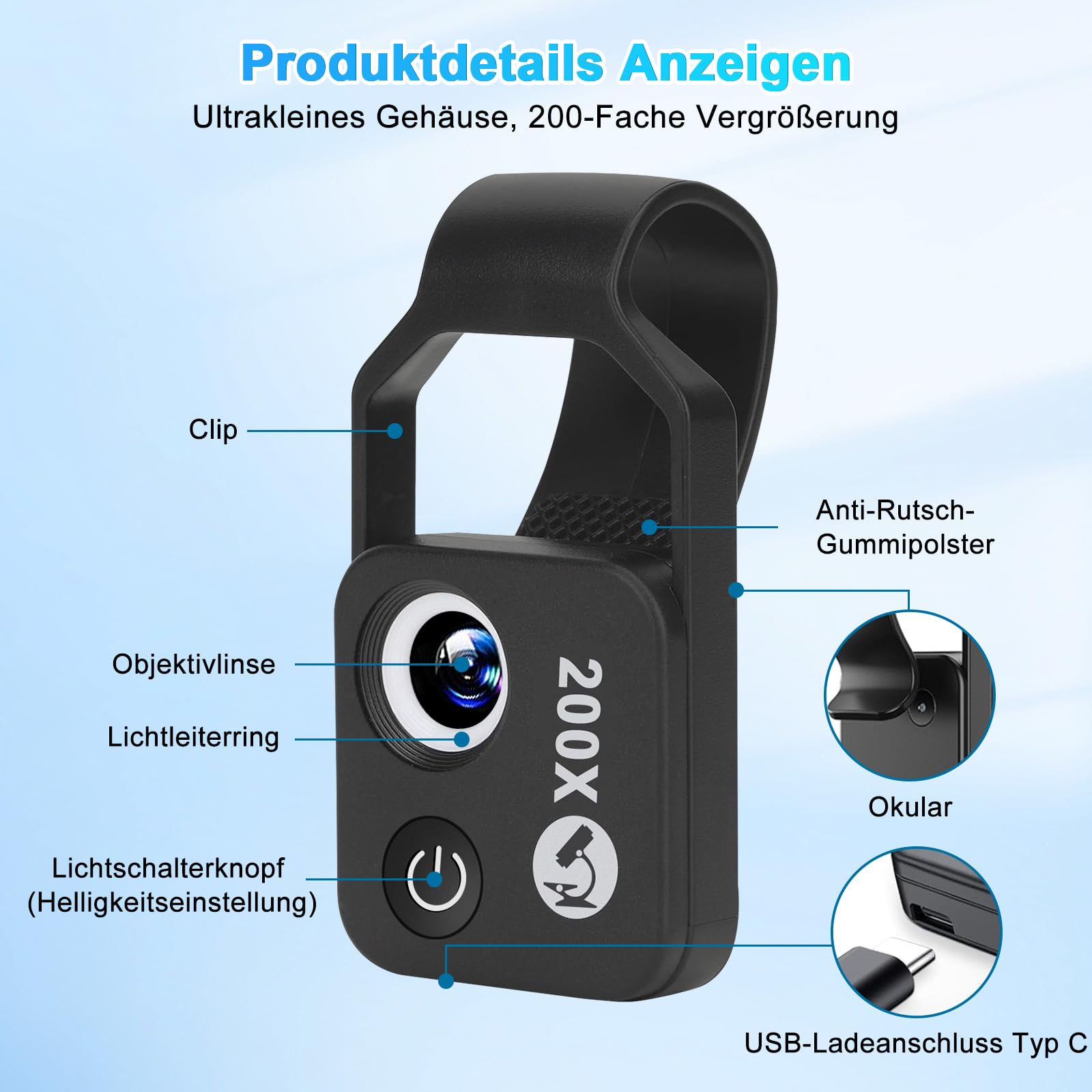 ["【200X Mini-Microscope for Smartphone Camera】 Explore the microscopic world with your mobile phone. You can experience the microscopic world around you anytime, anywhere! Our microscope can be attached to the main camera of your smartphone and can capture 200x high-resolution photos and videos for you. Phone mini microscope can add a new dimension to your photography and ignite a love for science in young people.","【200X Smartphone Microscope & CPL Lens】 This mobile microscope has a 200x magnification. It uses high-resolution optical microscope coating and a lens structure of 4 elements and 4 groups to achieve exquisite high-resolution microscopic effects, allowing you to observe shocking details that are invisible to the naked eye in everyday objects. Equipped with CPL lenses, it can effectively eliminate reflections and restore the true color of objects. Enjoy the wonderful world that is invisible to the naked eye.","【Portable Microscope with Light】 The USB mobile microscope has built-in 6 ring-shaped LED lights with 2 brightness modes that can provide brighter illumination for your images. Compact design, can be carried and stored in a small bag. It can be used frequently for children's exploration, insect observation, jewelry and stamp appraisal, health diagnosis, outdoor adventures, and other areas. 200X mobile microscope with LED light is the perfect device to start exploring the microscopic world around you.","【Easy to Use】 Easy to use, no app required. Adjust the microscope clip to the phone camera so that the microscope lens aligns with the phone's main camera. Hold the button for three seconds to turn on the LED light. When taking pictures, you must be close to the object's surface and parallel to it. If a black circle appears on the screen, please zoom in the phone screen to a digital zoom range of 1.2-1.9x. (No quality issue, just application tips) The higher the pixels of the mobile phone, the better the recording effect.","【Suitable for Most Smartphones】 With just one smartphone, you can explore the microscopic world from anywhere. Whether you are a curious enthusiast or an aspiring scientist, this 200x smartphone microscope opens up a world of discoveries and delivers exciting results. It is the perfect tool for explorers"]