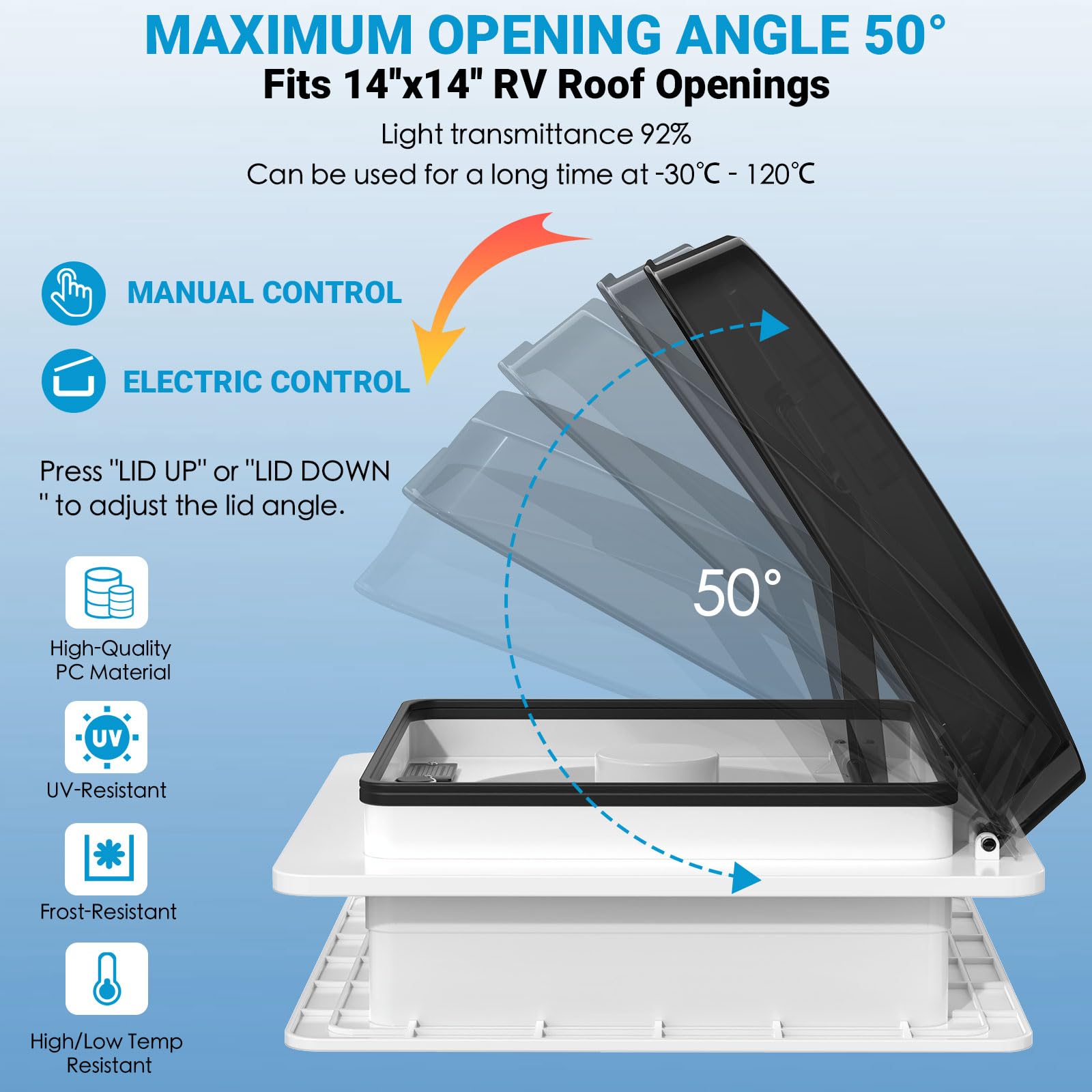 Independent channel design ceiling fan function: Provides uniform permanent ventilation (when closed) and circulates air inside and outside your RV on rainy days.
