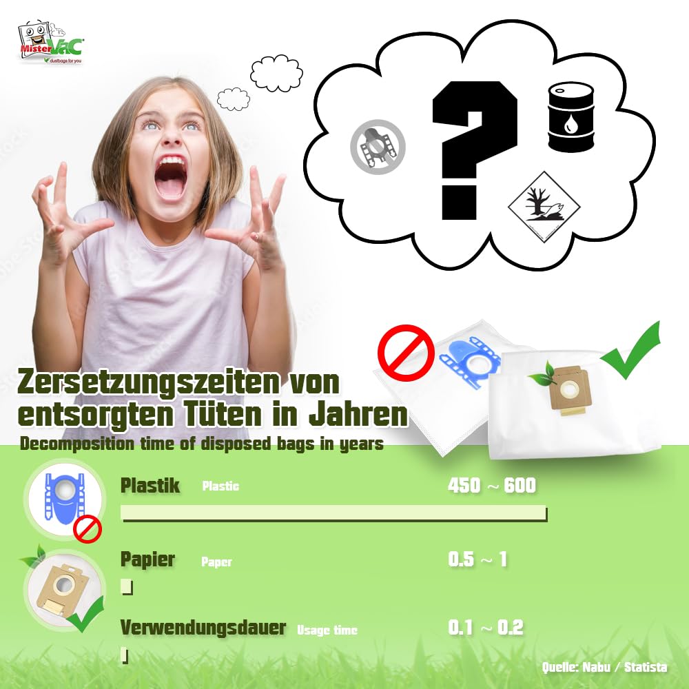 ["✔ Delivery: 20x Vacuum bags multi-layer special filter paper with high fine dust filtration","✔ Fits perfectly in the vacuum cleaner's bag holder, bag expands completely in the storage space while vacuuming","✔ Designed to hold maximum amount of dust thanks to multiple folding, remaining strong and durable. Our vacuum bags are made of high-quality material.","✔ Suitable for dry vacuuming of dust classes L and M, light to medium suction material, *not suitable for cement dust, construction dust (drilling, grinding, and sawing concrete) as the pores can quickly clog, causing the bag to burst","✔ ADVANTAGE: MisterVac is the manufacturer of the product mentioned above, therefore we guarantee 100% compatibility and maximum performance for this model."]
