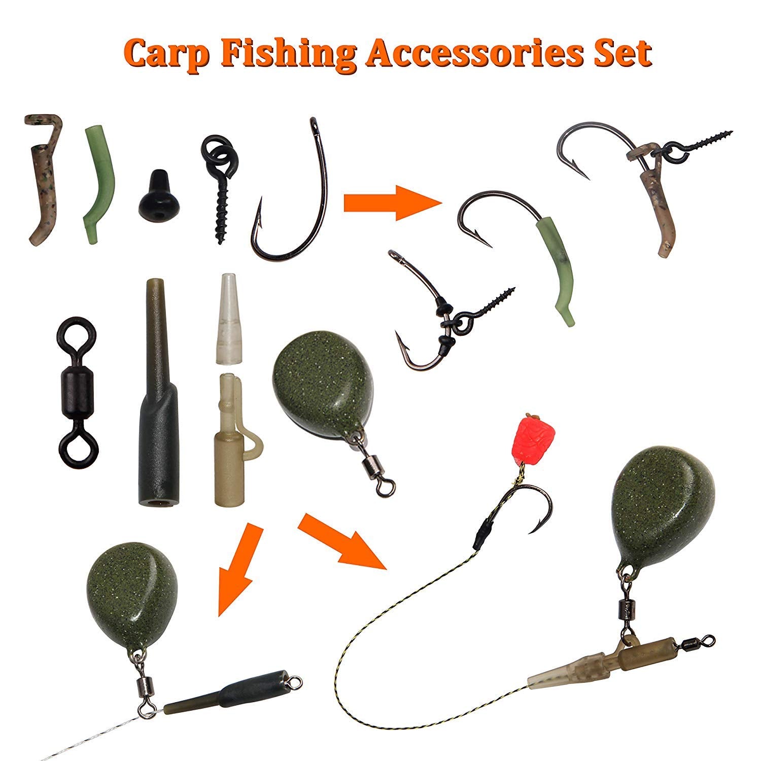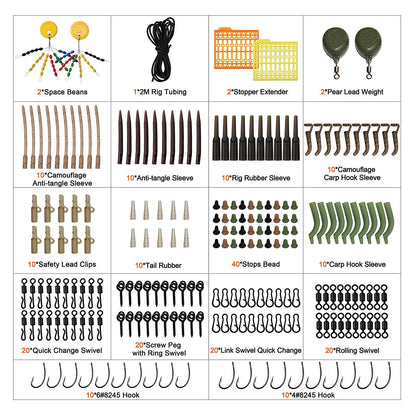 ["The fishing accessories set includes 217 pieces/lot of necessary gear for carp fishing: space beans, rig tubing, stopper extender, pear lead weight, anti-tangle sleeves, rubber sleeves, carp hook sleeves, safety lead clips.","And include tail rubber, stoppers, carp hooks, quick change swivels, screw with ring swivels, link swivels, quick links, rolling swivels, and hooks.","Made of high-quality material. 17 different types of accessories, each type of them arranged in different small grids, easy to access.","Comes with a selection side by side packed box, easy to store and transport. Various sizes of accessories, meet multiple fishing needs; box size: 4.5 X 3.8INCH. Great gift for fishermen.","Best service, you can buy with confidence, because we want your satisfaction 100%. If the product did not meet your expectations or you need a replacement, please do not hesitate to contact us."]