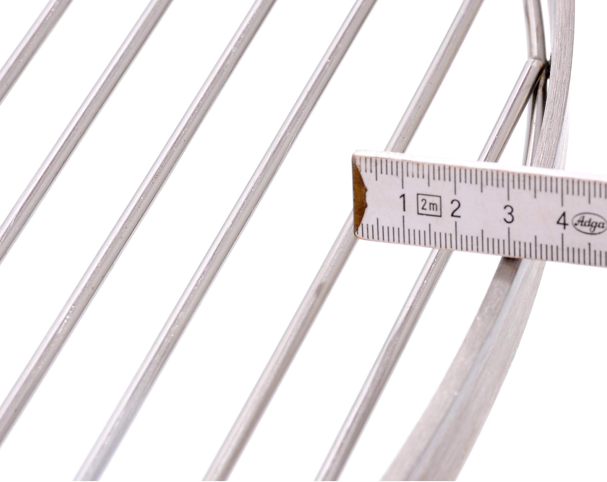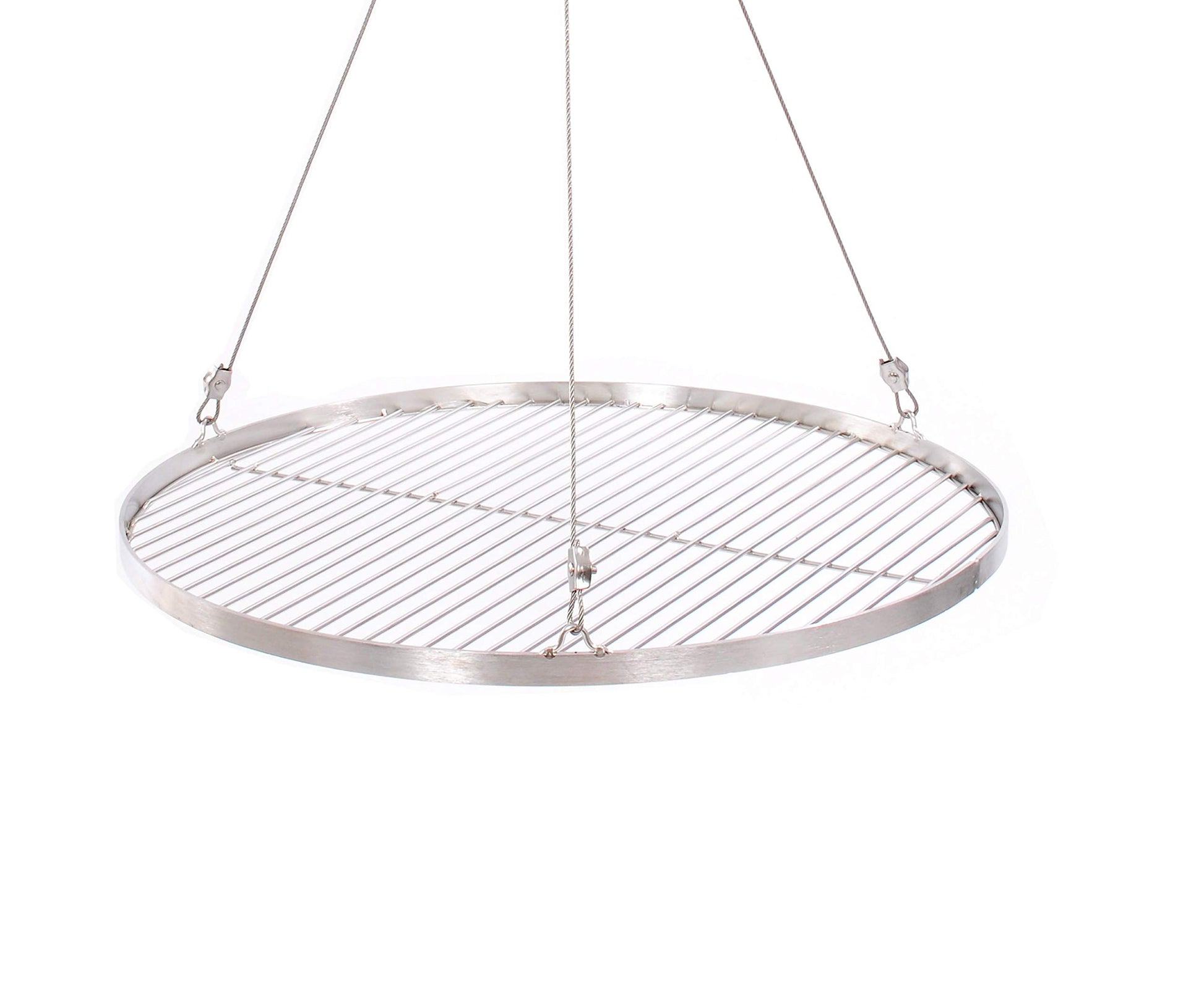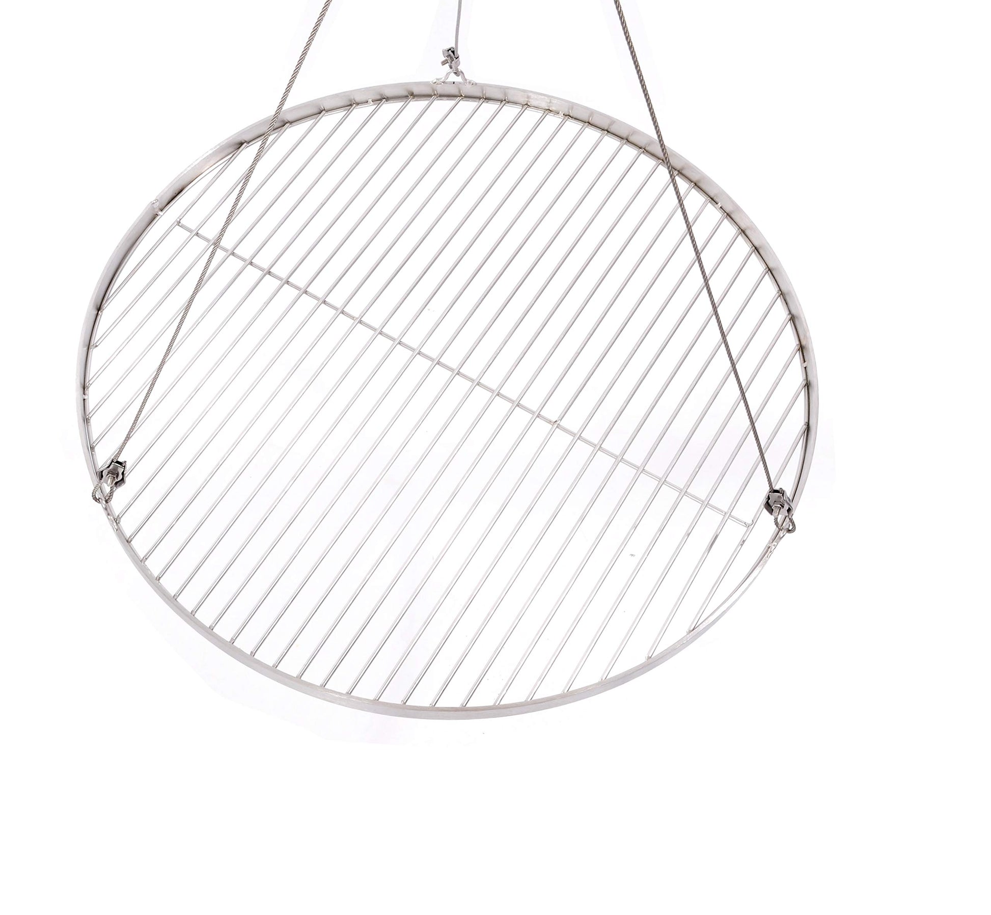 "The offer includes a stainless steel 304 grill grate with a diameter of 57 cm, incl. railing and rope (pre-assembled) - brand new in original packaging! Designed for use as a swing grill or as a grill grate for a three-legged grill or custom build. Grill rod diameter 4 mm, clear distance between rods 14 mm, weight 2.7 kg. NEW: The rope suspension can be individually readjusted to ensure your grill grate hangs horizontally at all times. Grill grates made of stainless steel 304 are significantly higher quality and more corrosion-resistant than the commonly offered V2A or 202 stainless steel. The grill grates are corrosion/heat resistant and food safe."