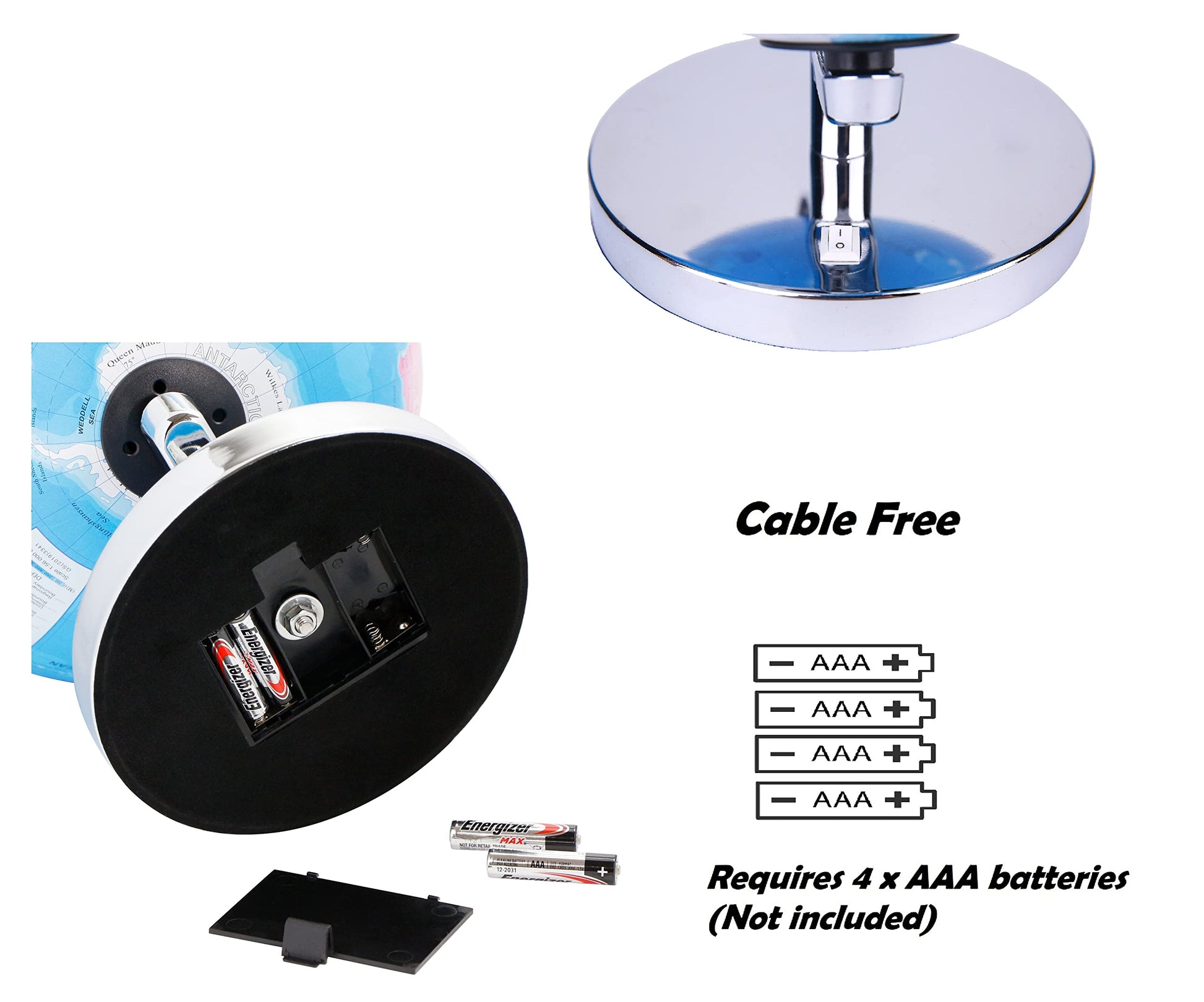["Cordless Lighting: Operates with patented Battery-Only Technology, no more hassle with cables. Features a political map when the LED is off. and turn on the cable free, with deep blue background and highlighted stars. Requires 2 x AA batteries (NOT included). Batteries not included.","Fun and Education: Perfect fit for the educational learning approach, where Science, Technology, Engineering, Arts and Mathematics (S.T.E.A.M.) serve as entry points for guiding children and learners and for critical thinking. Our globe also has current details, encouraging curious children to explore the world of science.","Gift Idea: Exerz presents this unique Alaysky double globe in premium quality. It is not just a great piece of interior decoration, but also a night light and a perfect educational toy for the ever-curious children, igniting their imagination and curiosity.","DIMENSIONS and CARE: Diameter: 23 cm on a sturdy stand."]
