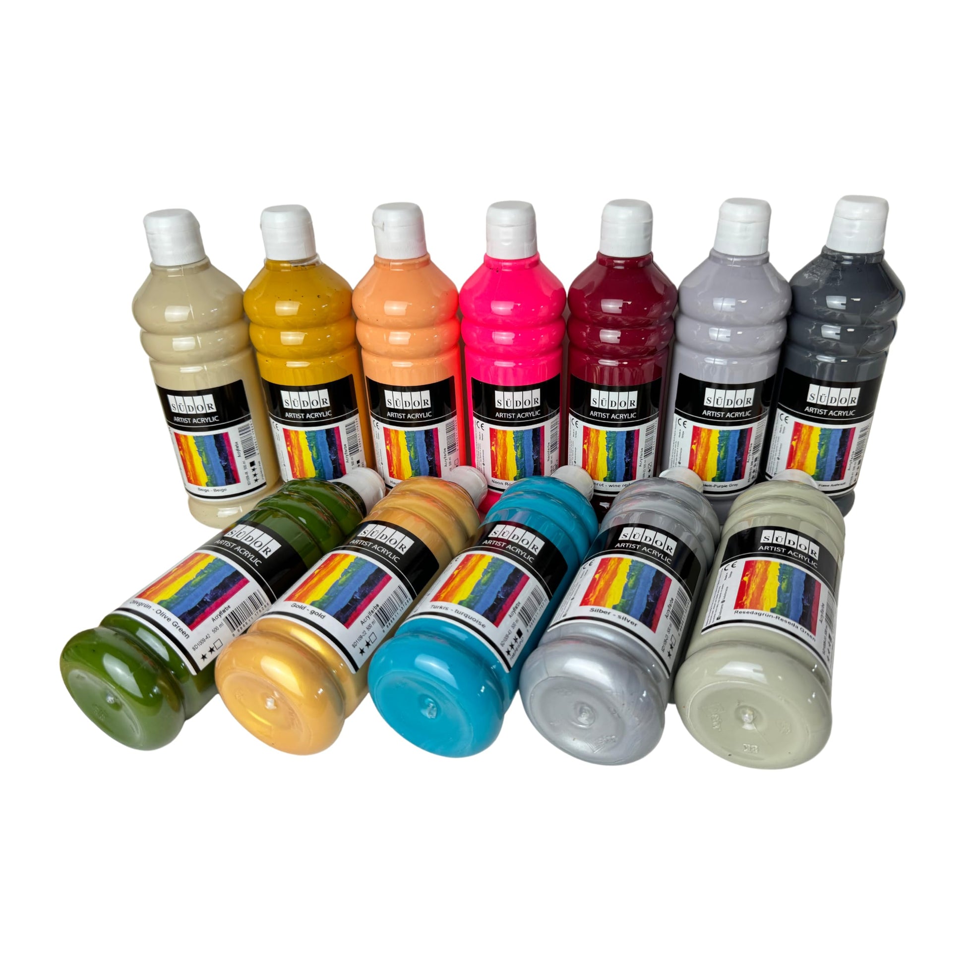 24 color set of acrylic paints, each 500 ml. Highly pigmented and opaque painting colors for canvas, pouring, wood, stone, paper, fabric, metal, etc. All-purpose colors. 24 x 500ml.