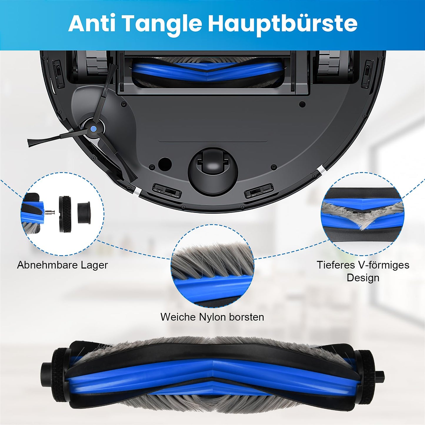 "【Efficient Cleaning】The T50 Pro Omni main brush features Anti-Tangle Technology, making it resistant to tangling with long hair. The 4.3cm long bristles of the side brush help you easily remove dust in corners.",