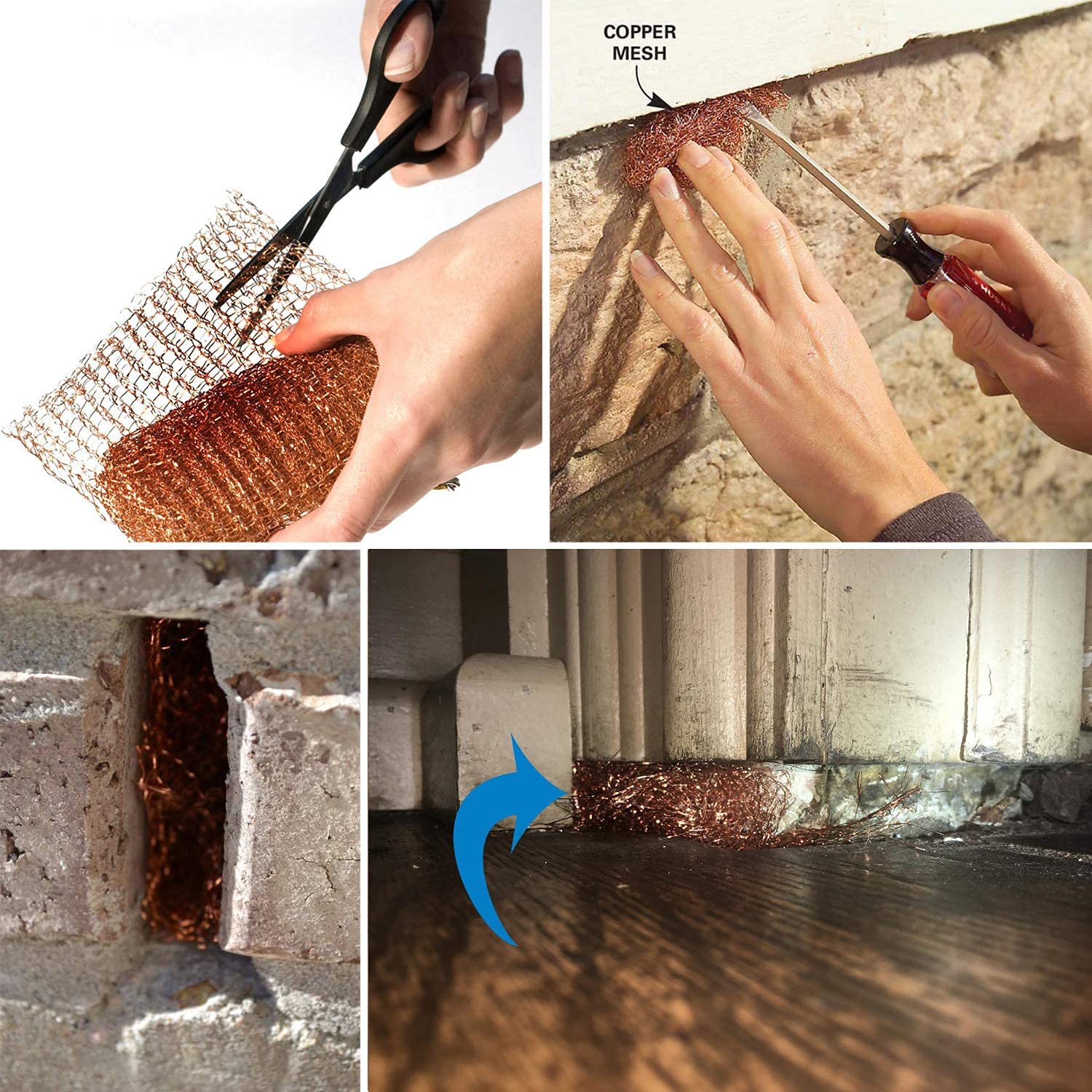 ["1.Material: Made of industrial 100% pure copper mesh ensures maximum life.","2. Function: You only need a pair of scissors to cut into different shapes, easy to bend but not easy to break.","3. Multi-purpose: Copper wool is ideal for cleaning laundry, DIY projects, copper scrubs, and protecting your vegetables and fruits.","4. Easy to install: Copper mesh is easy to cut and adjust to the size of the hole, cut the corresponding mesh and simply insert it into the hole.","5.Note: All copper meshes do not harm animals (including mice and slugs), use copper meshes to block the movement of animals to achieve the purpose of protection."]