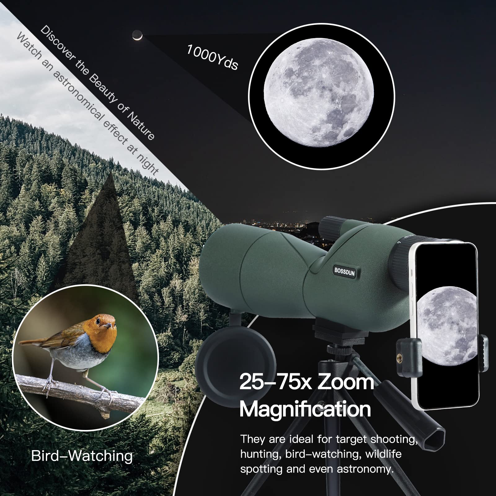 ["Unlimited zoom capability: Step into the world of the BOSSDUN 25-75X60 spotting scope - your gateway to versatile exploration. With a variable magnification range from 25x to 75x and a powerful 60mm objective lens, you can easily zoom in on intricate details. Perfect for activities like archery, bird watching, wildlife observation, hiking, camping, and more.",