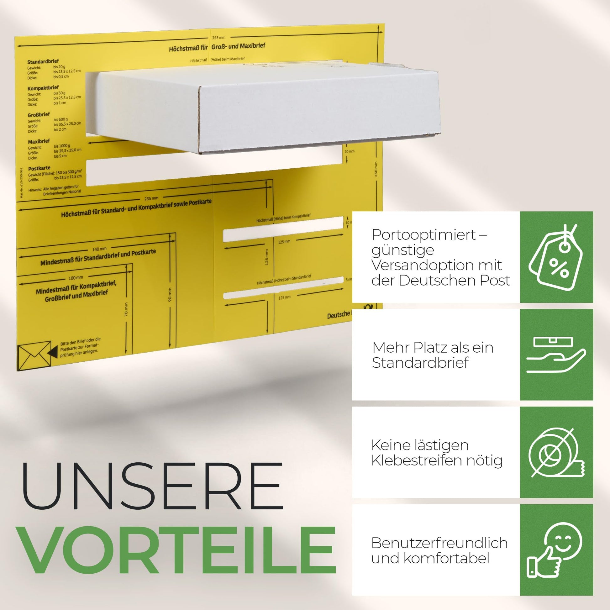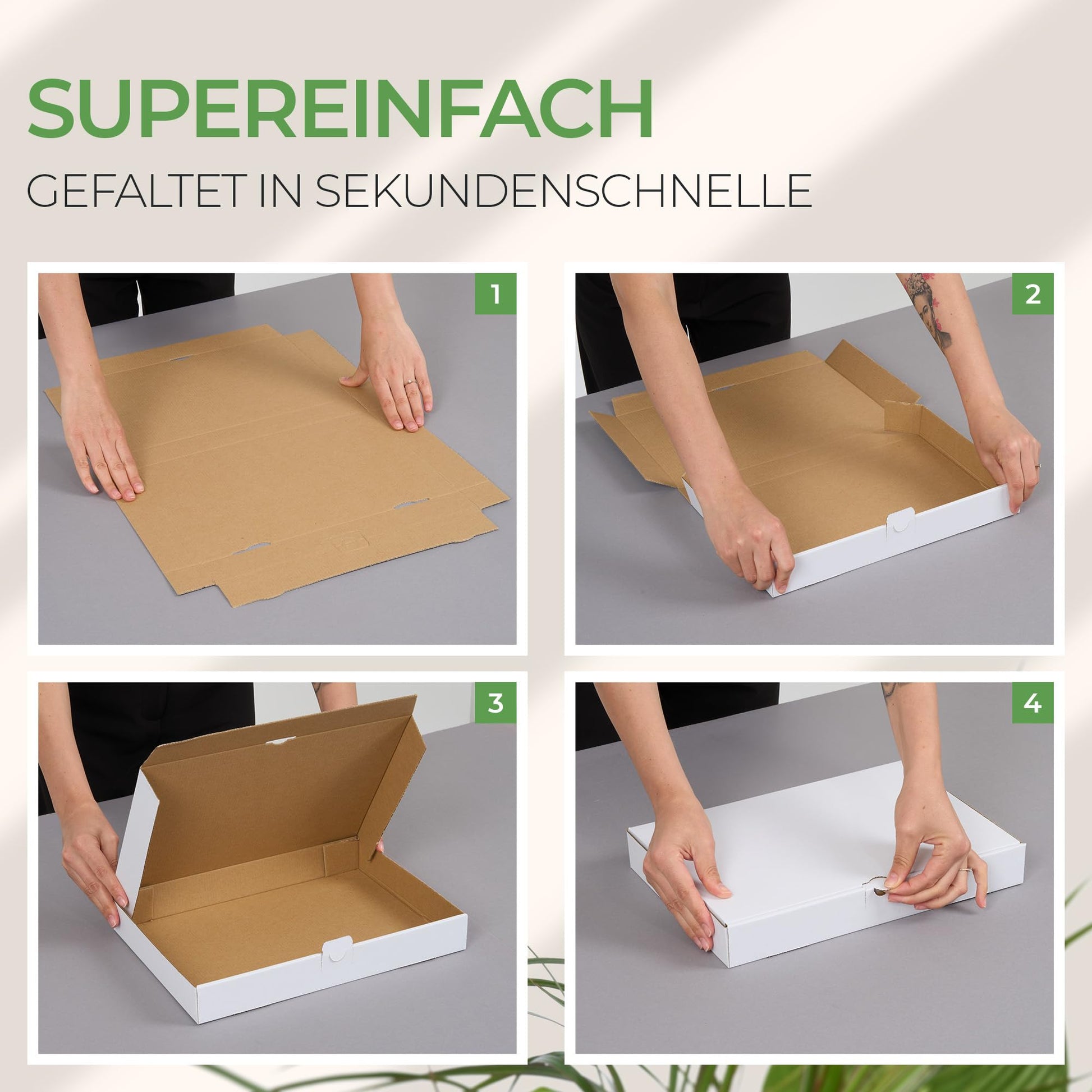 ["Outer dimensions: 13.78 x 9.84 x 1.97 in; Inner dimensions: approx. 13.46 x 9.45 x 1.81 in - suitable for formats up to DIN A4 and B4","Sturdy maxi letter box for goods shipments - ideal for cheap shipping of books, media, and goods up to 4.41 lbs","No adhesive tape needed - practical tuck-in flaps ensure secure closure without additional material","Quick assembly thanks to clearly visible folding edges - ready for use with just a few simple steps","Ideal for cheap goods shipments with Deutsche Post - also usable with DHL, Hermes, DPD, GLS and UPS"]