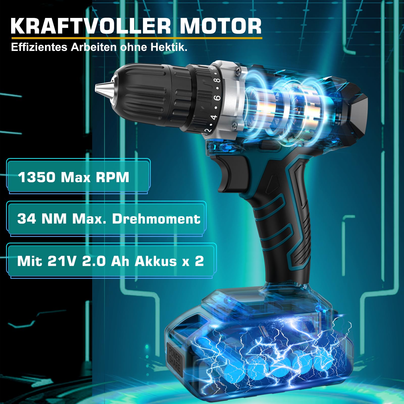 "Double Battery Life & Longer Runtime: The 21V cordless drill driver comes with two 2.0 Ah lithium-ion batteries. One battery can be fully charged in just 1.5 hours and provide approximately 1 hour of continuous use. Each battery is small and lightweight, making it easy to transport and swap whether you're working indoors or outdoors. When not in use, please store the batteries in the charger to extend their lifespan.