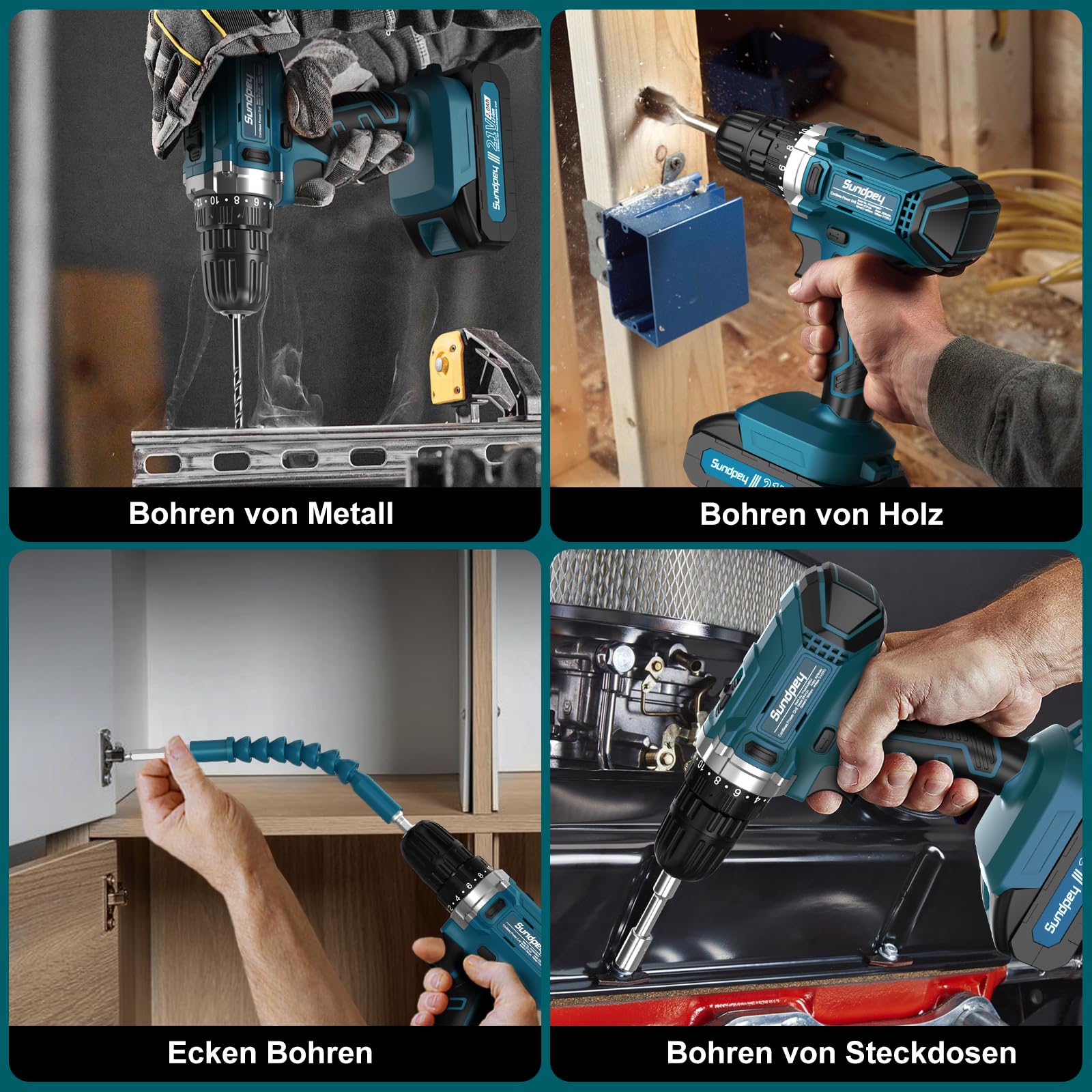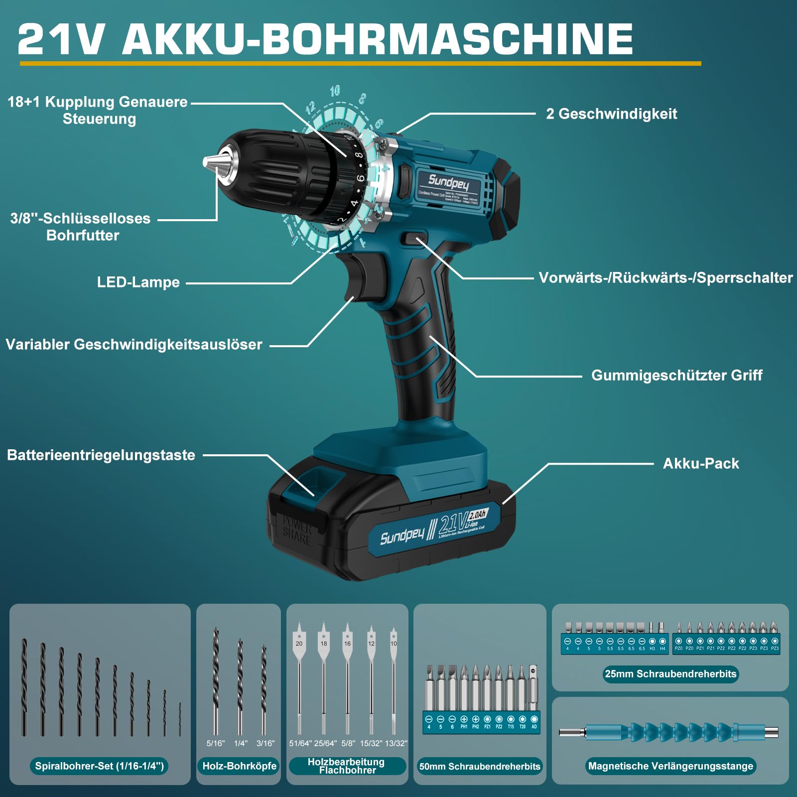 "21V Cordless Drill Driver with LED: The Sundpey 21V cordless impact drill driver is versatile. The cordless drill combo kit can tighten screws and drill holes in plastic, wood, ceramic, and glass. It features a built-in LED light and two speeds (0-350 RPM, 0-1350 RPM), with a maximum chuck size of 3/8'' (10 mm) and torque settings of 18+1 (max. 34N.m). The hand drill driver weighs only 1.5 kg including the battery and can be easily operated with one hand.