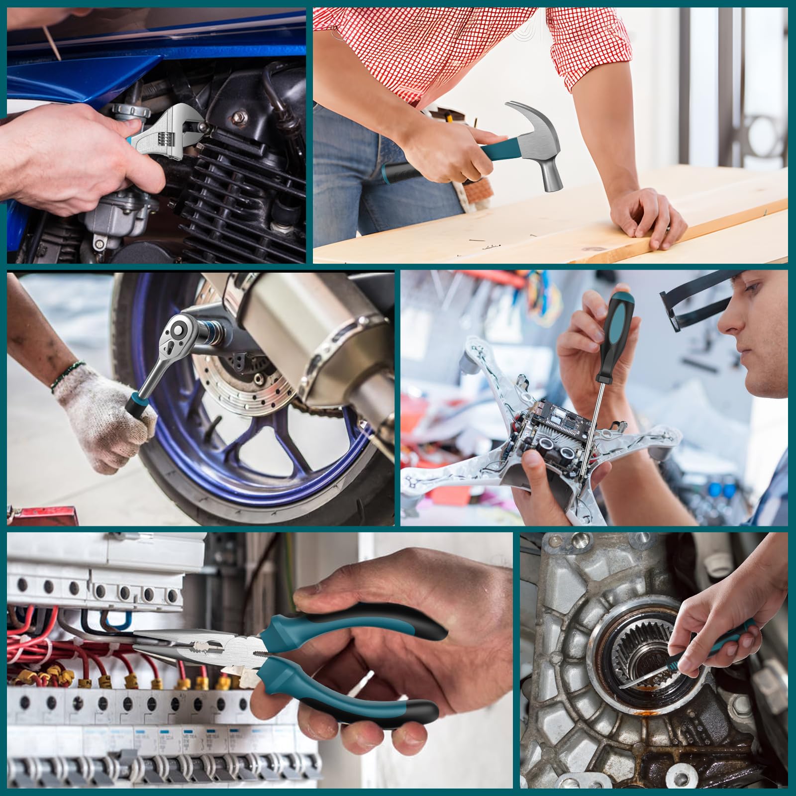 "Comprehensive Tools: This household and automotive repair tool kit includes essential practical tools. The toolbox contains a hammer, an adjustable wrench, needle-nose pliers, a tape measure, a hex key set, a screwdriver, a socket wrench, spiral drill bit sets (1.5mm 2mm 2.5mm 3mm 3.5mm 4mm 4.5mm 5mm 5.5mm 6mm), wood drill bits (5mm 6mm 8mm), stainless steel ruler, woodworking pen, extension rod, 200mm flexible shaft, expansion screw sets (134 pieces), rechargeable electric drill (rechargeable batteries and charging adapter), and more.