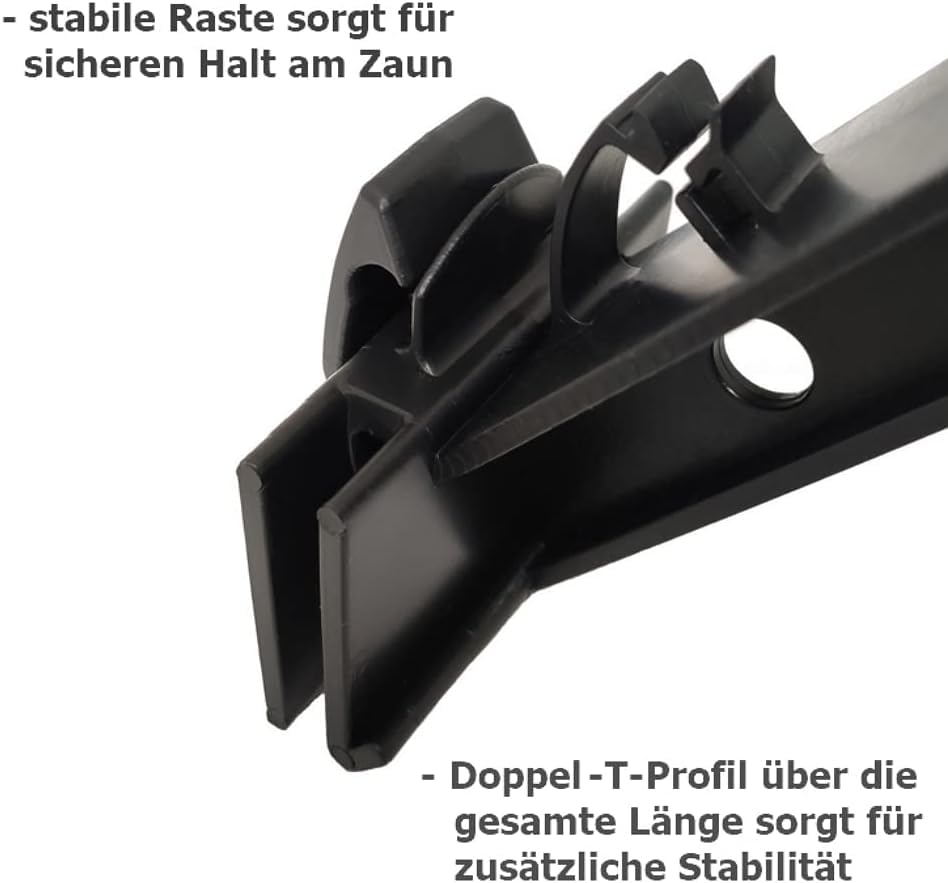 Sturdy latch and double T construction ensure secure attachment to the fence even under load, no sinking possible. Many attachment options for different materials (see pictures).