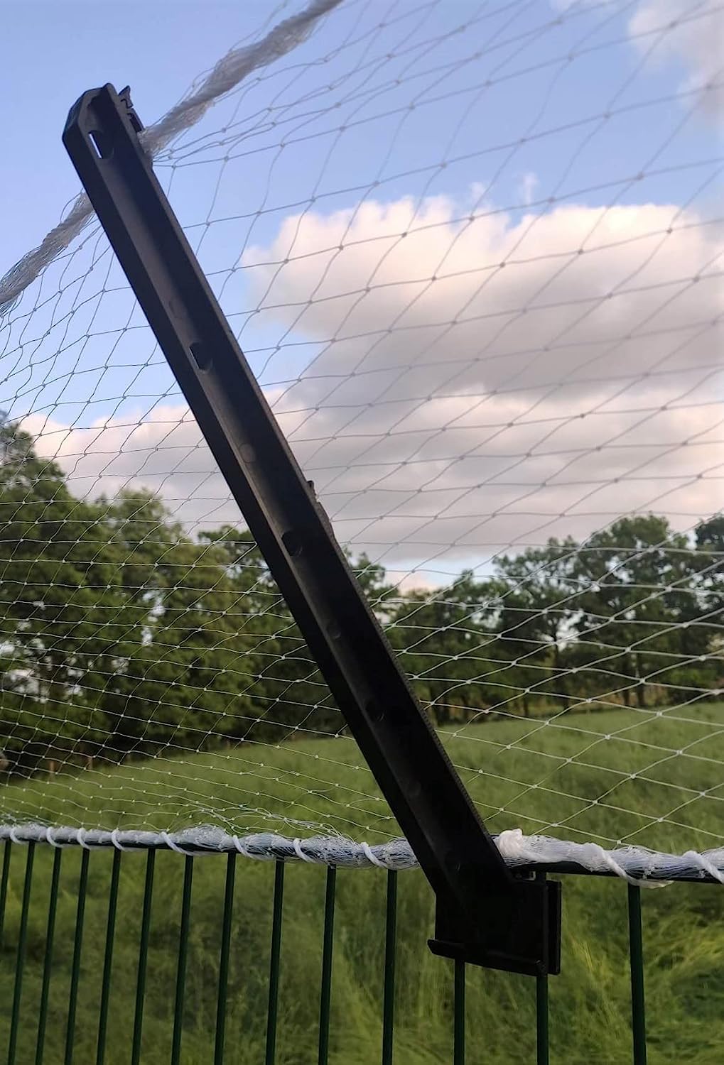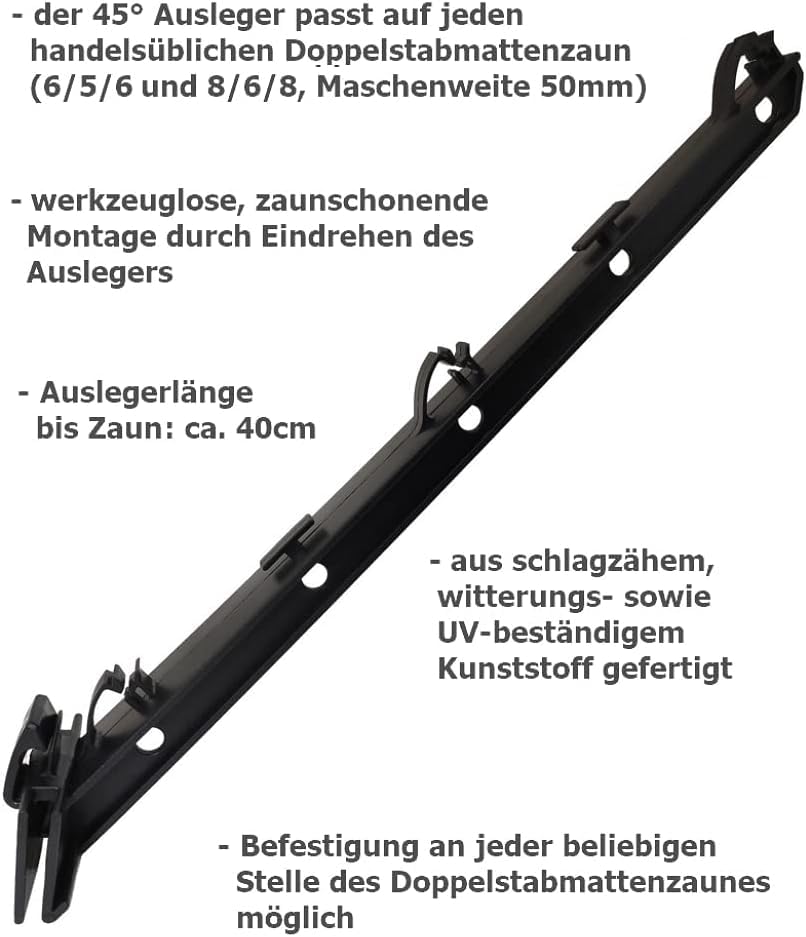 "Beachten Sie: The 45° anti-climb guard is suitable for common double rod mesh fences (6/5/6 and 8/6/8, mesh size 50mm). Please make sure you have a double rod mesh fence before ordering. For single rod mesh fences, you may need our adapter. Link: https://www.amazon.de/dp/B0DK5CN6Q4. In case of very low fences, a simple net may not be sufficient. In this case, additional electricity should be installed (see product description below). Package contents: Anti-climb guard (without accessories such as wire/nets, etc.).