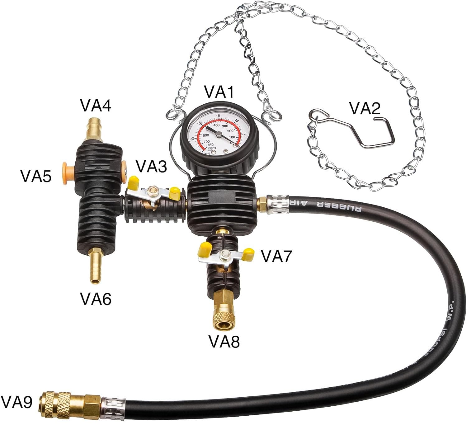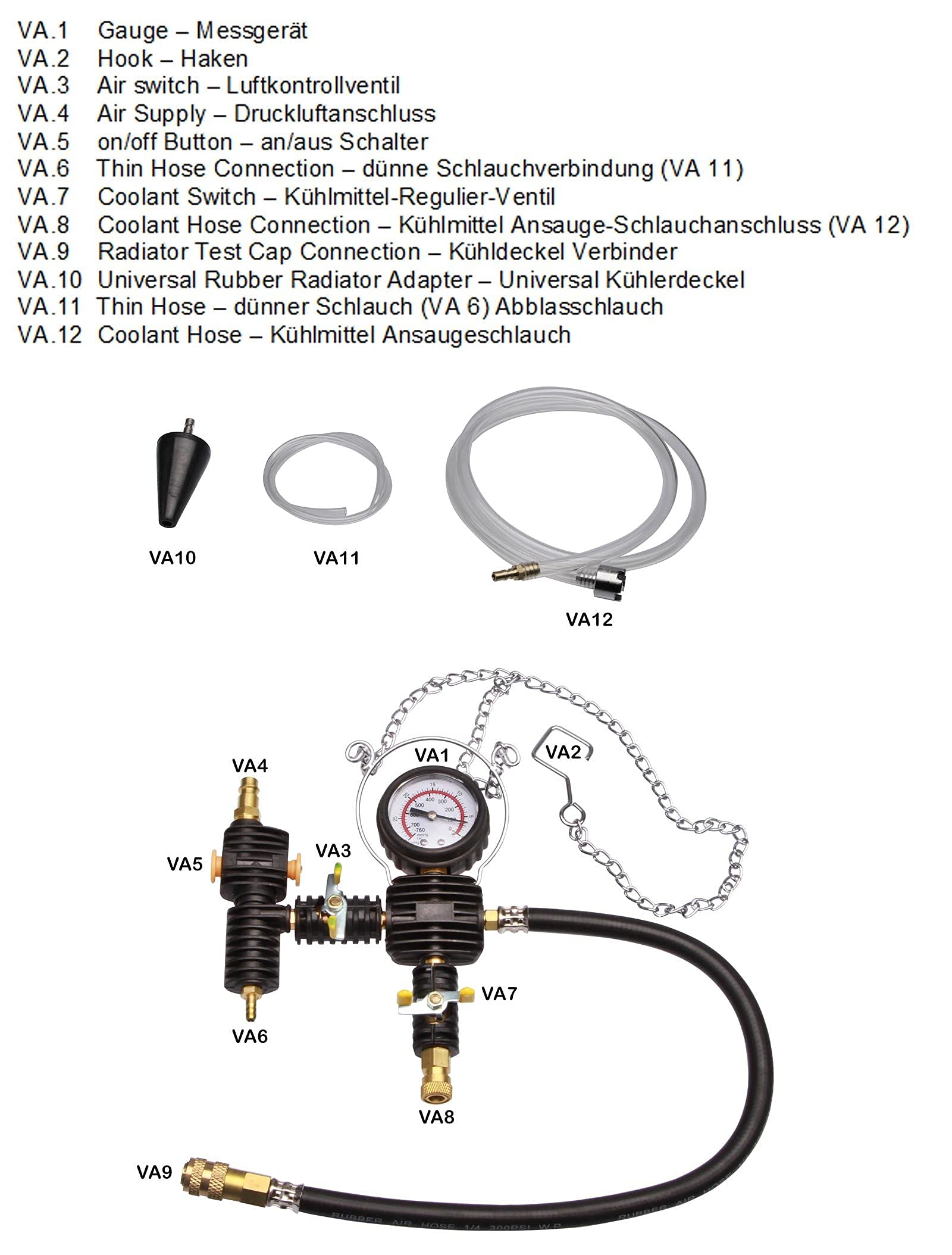 ["Cooling system tester radiator pressure tester with various adapters","By building up pressure with the hand pump, cooling systems can be tested.","The compressed air connection is used to create a vacuum.","We are clearing out our stock at a low price due to overstock."]