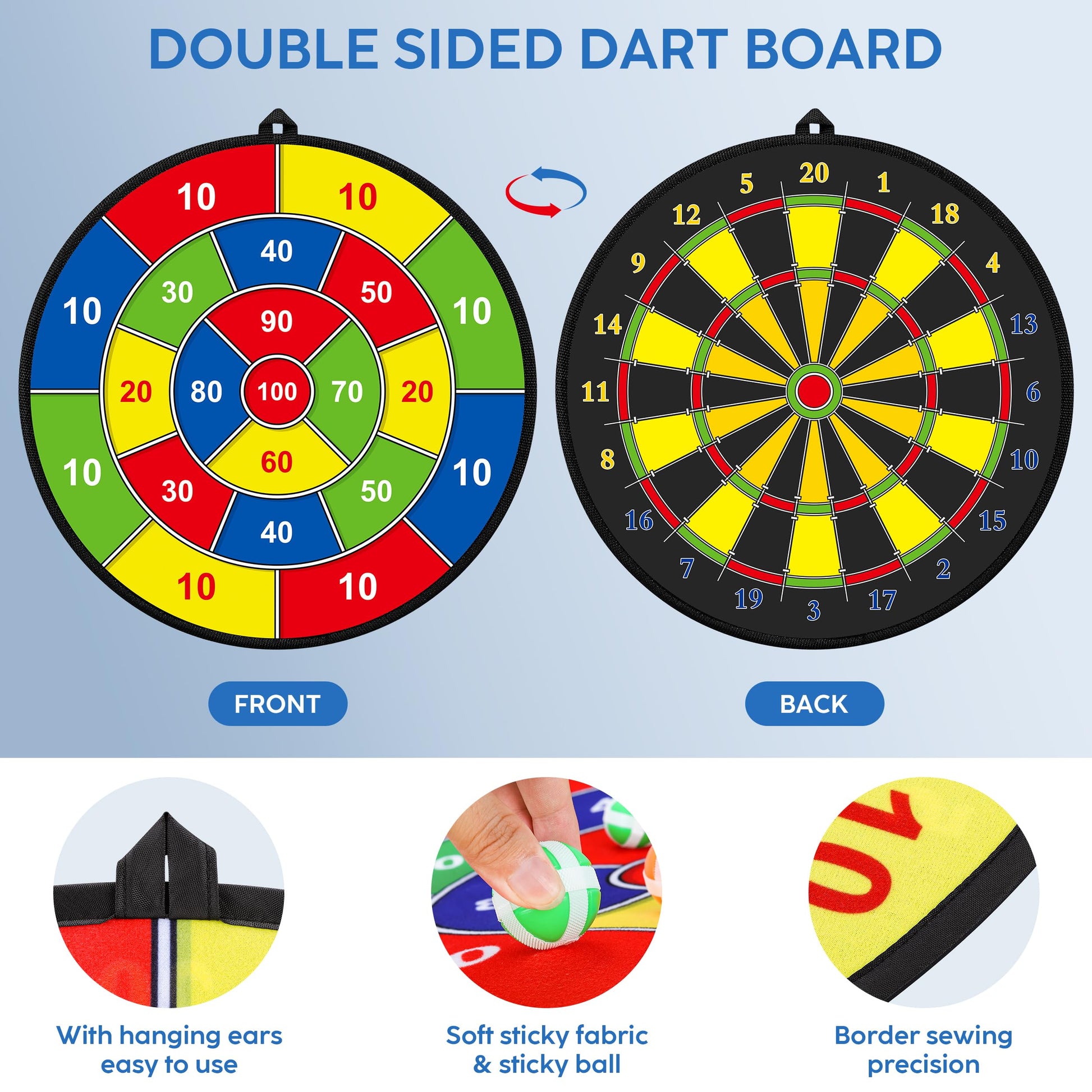 ["Giant Size Dartboard: Our double-sided 29-inch dartboard is a fun, safe, and challenging toy for kids. This game allows children to train their hand-eye coordination, precision, and concentration. It provides the opportunity to interact with friends and family, increasing the fun and competitive nature of the game.",