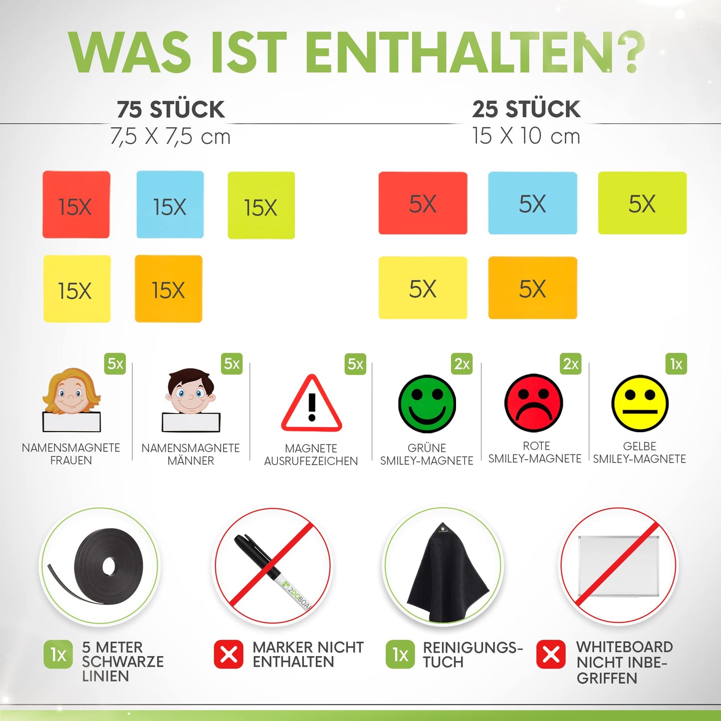 "VIEL PLATZ ZUM SCHREIBEN: Trockenlöschmagnete in 2 Größen und 5 Farben werden mitgeliefert: 25 Stk. 15 x 10 cm (5 grüne, 5 gelbe, 5 blaue, 5 rote und 5 orangefarbene) und 75 Stk. 7,5 x 7,5 cm (15 grüne, 15 gelbe, 15 blaue, 15 rote und 15 orangefarbene). Dieser Werkzeugsatz eignet sich für normale magnetische Whiteboards (NICHT INBEGRIFFEN). Für Glastafeln ist er NICHT GEEIGNET!"