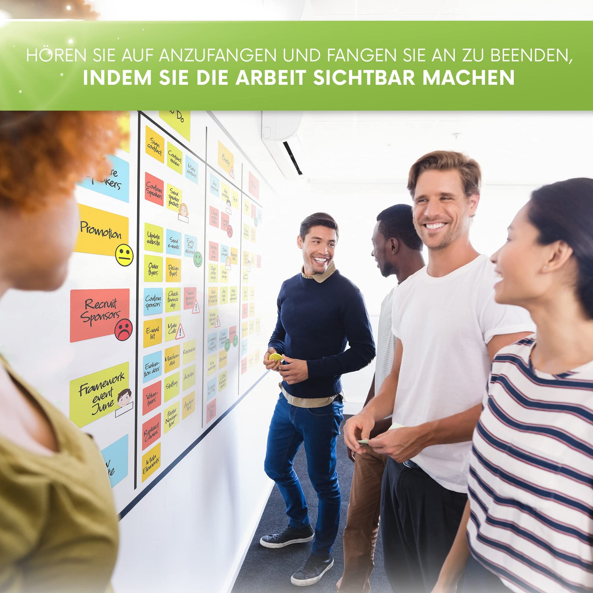 "AVATAR-, SMILEY- UND ANDERE EXTRA SCRUM MAGNETE INKLUDIERT - Enthalten sind außerdem 5 Meter magnetische schwarze Linien für Spalten und Zeilen, 5 Gefahrenmagnete, die auf Probleme hinweisen, 10 Trockenlösch-Avatar-/Namensmagnete (5 Männer, 5 Frauen), die zeigen, von wem an welcher Aufgabe gearbeitet wird, und 5 Smiley-Magnete zum beschriften, die für etwas Abwechslung sorgen"