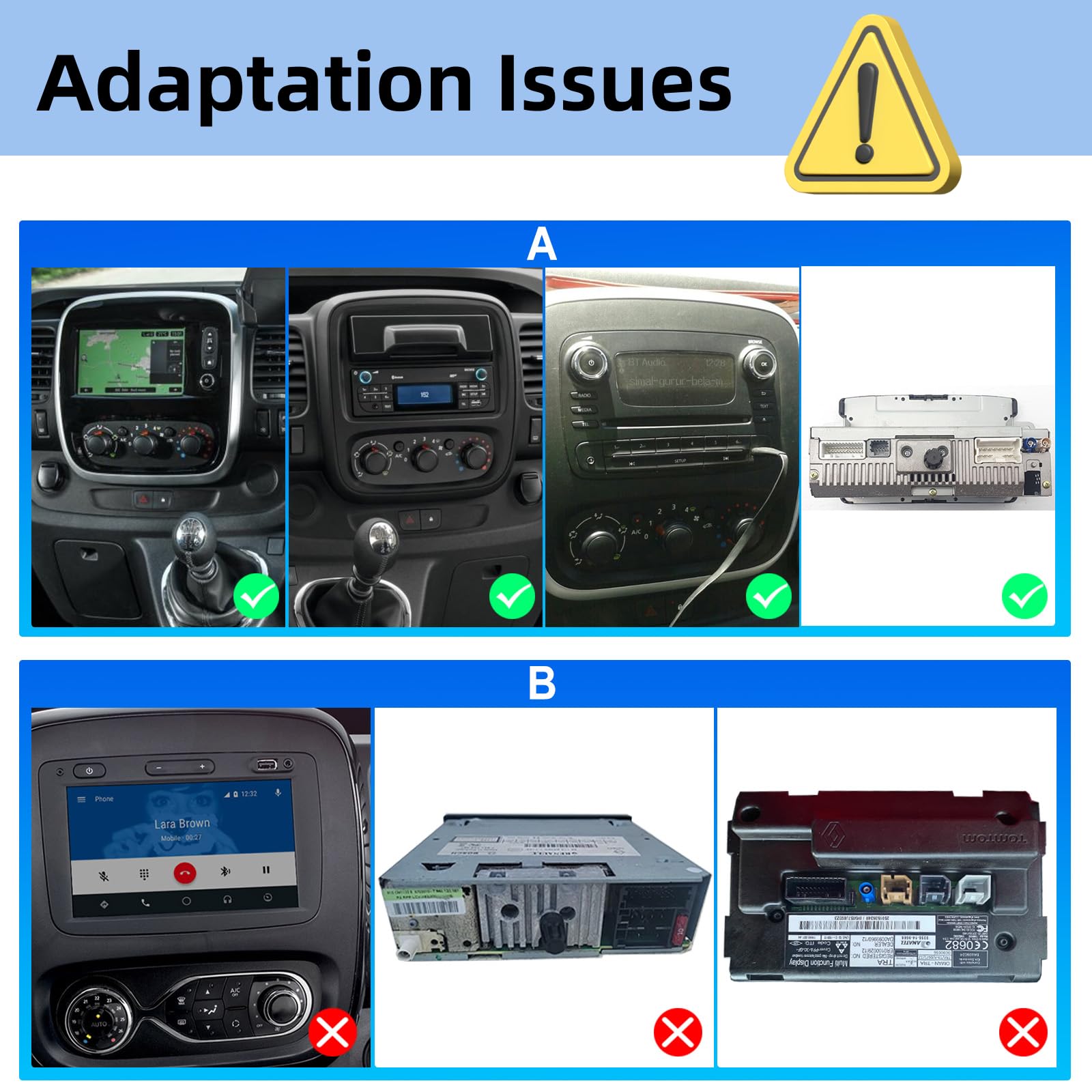 ["Applicable vehicle models] For Renault Trafic 3 (2014-2021)/For Renault Trafic X82 (2014-2019)/For Opel Vivaro B (2014-2019)/For Fiat Talento (2015-2019), 9-inch touchscreen car radio with Android system, 2GB RAM, 64GB ROM, Quad-Core. Dimensions: 10.43 (Width top) x 8.66 (Width bottom) x 10.63 (Height) inches. Note: Please send us the picture of your original center console if you are not sure if the product fits, we will confirm for you.","Wireless Carplay and Android Auto] Supports wireless and wired Carplay and Android Auto. You can connect your smartphone to the car radio via Zlink to use your phone's app on the car radio.","Integrated Bluetooth and WiFi connection] With built-in Bluetooth, you can connect your phone to enjoy Bluetooth music, make hands-free calls, and use voice control. With the WiFi connection, you can connect the car radio to WiFi or hotspot to surf the internet and download various apps.","GPS navigation and FM/RDS radio] Equipped with GPS module, you can use online/offline maps through the pre-installed "HereWego" maps app. You can also use other map apps of your preference. With FM/RDS radio, support frequency range 87.5-107.5, maximum 6 channels stored, you can enjoy your favorite radio program.","Other functions] Supports other functions as well: steering wheel control, HiFi sound, split screen, and 2 USB inputs, etc.","[NOTE] - Some original plastic frames of the center console are slightly narrower than our device. In this case, you will need to cut a small part of the plastic on both sides of the center console before installing the device, or it will not be able to secure properly. This process does not affect the use of the vehicle or the function of the car radio. Please do not purchase this product if you are not willing to do this."]