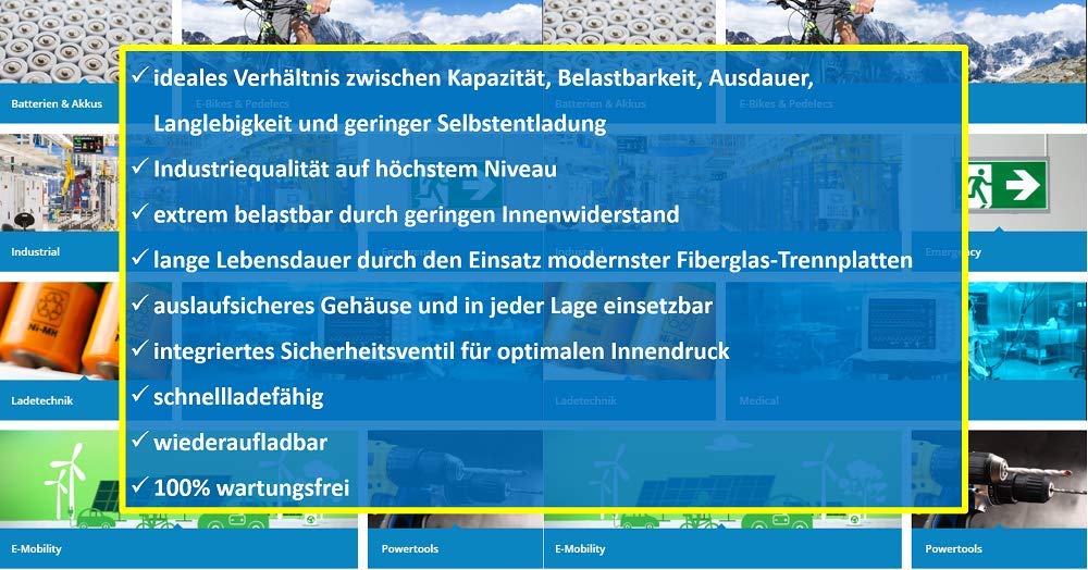 ["2x Kung Long VdS-Lead-AGM-Battery WP7.2-12, 12V, 7.2Ah, 0.25" Faston","Applications: Security systems, UPS systems, commercial use, emergency lights, cash registers, communication systems, alarm systems, cigarette and drink vending machines, boat or electric motors, medical devices, electric vehicles, scooters, and more.","Length (net): 151 mm Width (net): 65 mm Height (net): 102 mm","Features: - Absorbent Glass Mat (AGM) technology - maintenance-free (no need to refill water) - sealed, valve regulated (VRLA) - very low self-discharge, < 3% per month - very long lifespan","compatible with stairlift chairlift Flow 1 2 Minivator 950 2000 Acorn Superglide 120 and more."]