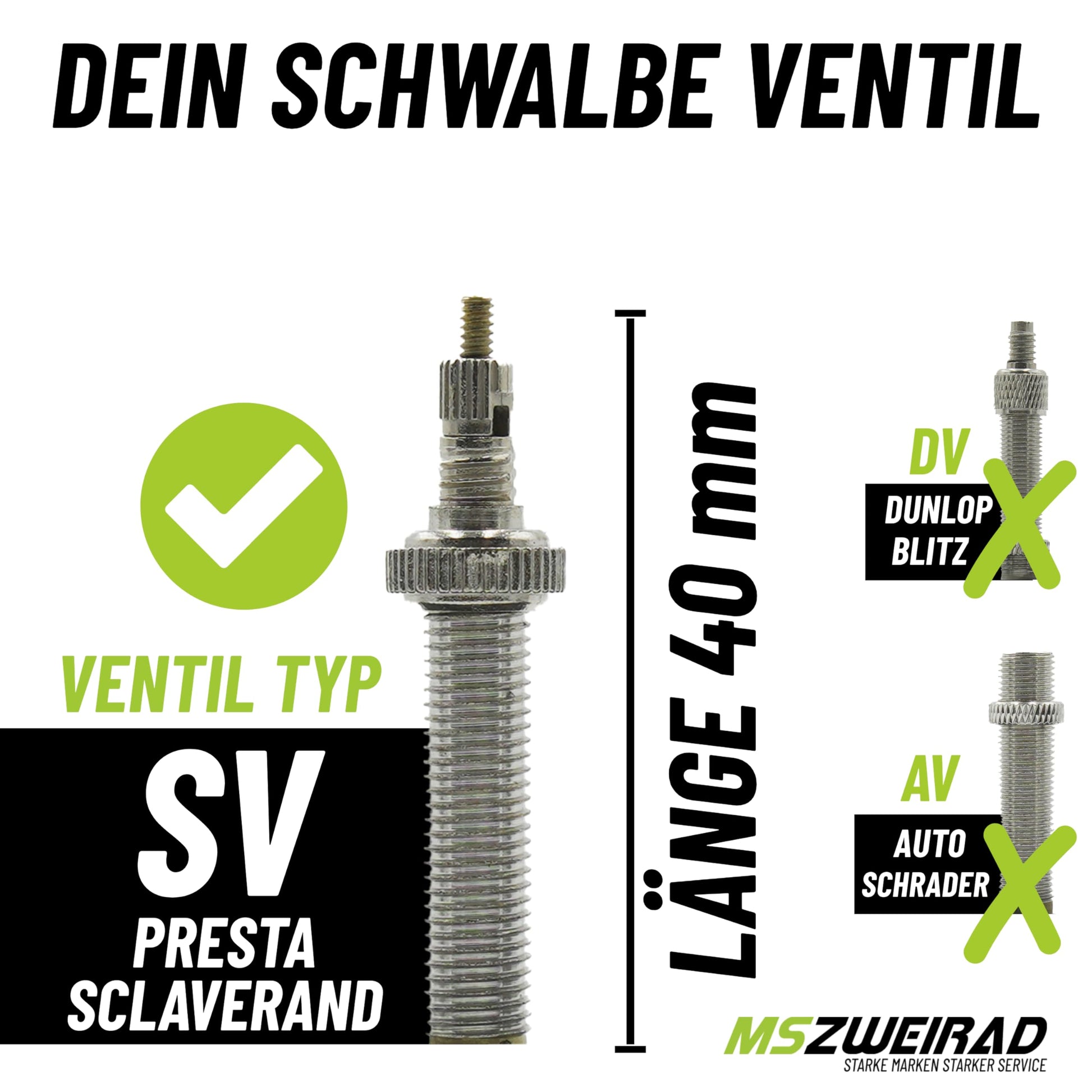 ["Set- The set consists of two Schwalbe tubes for bicycles with French valves including 3 sturdy MSZweirad tire levers.","Dimensions- Tube is suitable for wheel sizes: 27.5 and 28/29 inches, ETRTO size: 40/62-584/635, Valve: SV 40mm.","ETRTO dimensions- Suitable for sizes 40-584, 40-590, 40-609, 40-622, 40-635, 42-590, 42-622, 44-584, 44-622, 44-635, 47-584, 47-622, 50-584, 50-622, 54-584, 54-622, 55-622, 57-584, 57-622, 60-584, 60-622, 62-584.","Size Finder- Not sure which tube fits your tire? The Schwalbe tube filter helps you find the perfect tube that matches your tire.","Included- The set includes 3 sturdy tire levers from MSZweirad. These help you quickly and easily remove your tires from the rim. Thanks to the smooth surface, our assembly levers are easy and safe to use."]