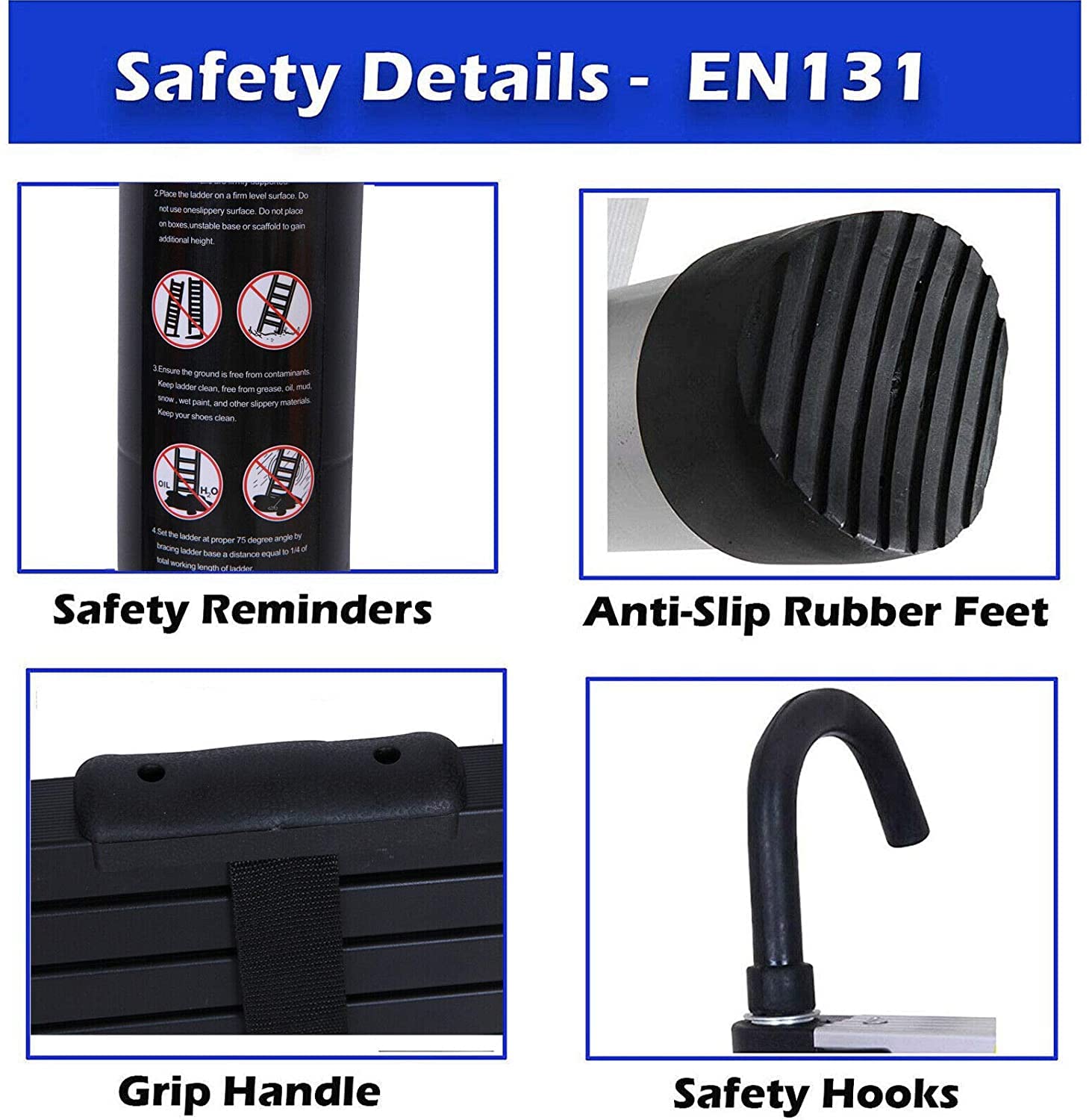 "Stability and Contraction: Hooks and widened base effectively prevent movements, large rubber foot covers are effectively non-slip, suitable for a variety of terrains, and effectively protect the indoor floor. Lightweight Portability: The ladder is made of aluminum, which is strong and can carry 330 pounds / 150 kg. Easy to carry multifunctional, portable telescopic ladder, suitable for indoors, outdoors, office, warehouse, yard, etc. Easy Operation - extend and retract, pull up one section when extending, hear a \"click\" sound, confirm that the left and right locks are present; to retract, unlock step by step, do not put hands on the \"step\" to avoid pinching hands. Safety Feature – Safety in design (certified to EN131). The lower non-slip rubber feet ensure your safety. Extendable ladder with safety hook: The hook can be easily disassembled to rotate 360°. You need a hook."