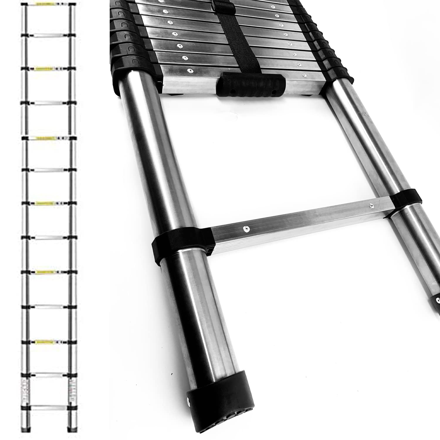 ["Safe and reliable: made of high quality stainless steel, 13 secure steps, each step has 2 individual locking knobs to prevent bumping and falling. 330 lb maximum load capacity and certified according to EN131;","Telescopic design: Adjustable height from 85 cm to 12.5 ft, convenient for many tasks and easy to transport;","Non-slip construction: High quality non-slip rubber feet, allowing the ladder to be easily secured to walls and floors. Each tread is striped for increased friction;","Easy to store and portable: Lightweight and compact, net weight approximately 28.2 lbs, easy to transport and store; a closure strap secures the ladder tightly and is easy to carry;","Multipurpose: Perfect for indoor and outdoor work, such as home and building maintenance, window cleaning, interior/exterior decoration, painting, and more."]