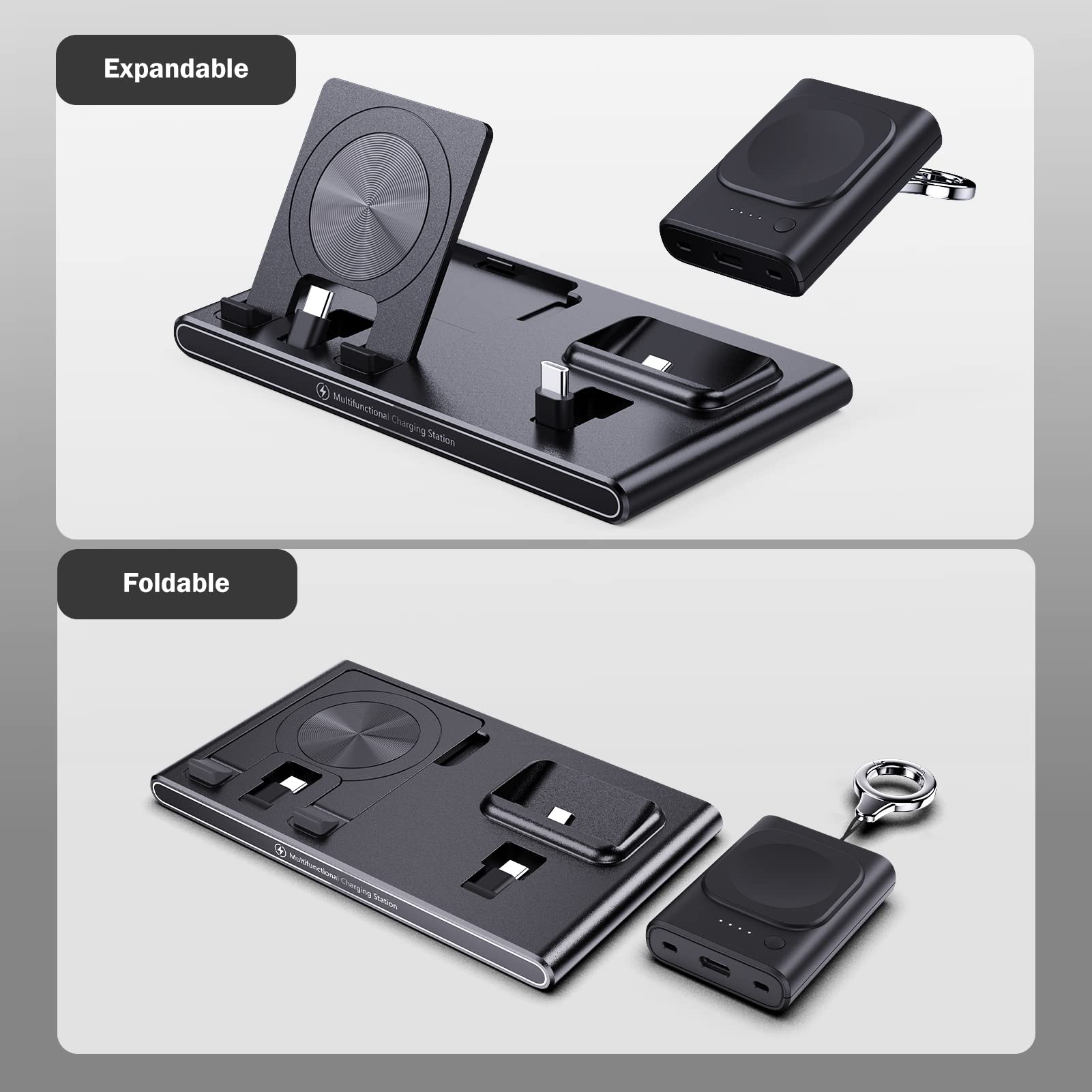 ["Good news for the Galaxy A series - For Samsung Galaxy A series phone users, there have been no multi-device charging stations available. The 3-in-1 charging station has been specifically designed for your Galaxy A series and charges all USB-C devices with Type-C connection. Now you can eliminate all messy cables and charge multiple devices at the same time.","Phone Friendly for Thick Cases - The charging stand is designed to charge phones with thick cases, leather cases, ring holders, or wallet cases. The Type-C connector can be adjusted to accommodate phone cases of different thickness, so you don't have to remove the case while charging.","Detachable Samsung Watch Charger - The small watch charger with a 1800mAh battery can be detached from the charging station, turning it into a portable power bank for your Samsung watch 5 Pro/5/4/3, charging the watch 2-3 times. It is small enough to fit in your pocket and handbag.","Foldable and Portable - This charging station has a foldable design. It can be folded into a slim unit when not in use, the compact and lightweight design is ideal for on the go. Remove the Type-C plug, it's a charging station. Take off the Type-C connector, it's a phone stand.","Universal Compatibility - The charging station is compatible with Samsung A series phones, Galaxy S series, Note series, Z Flip series, Z Fold series, and other phones with Type C; Compatible with Samsung Galaxy watches, Galaxy Buds Pro/Buds +/Buds 2/Buds Live."]