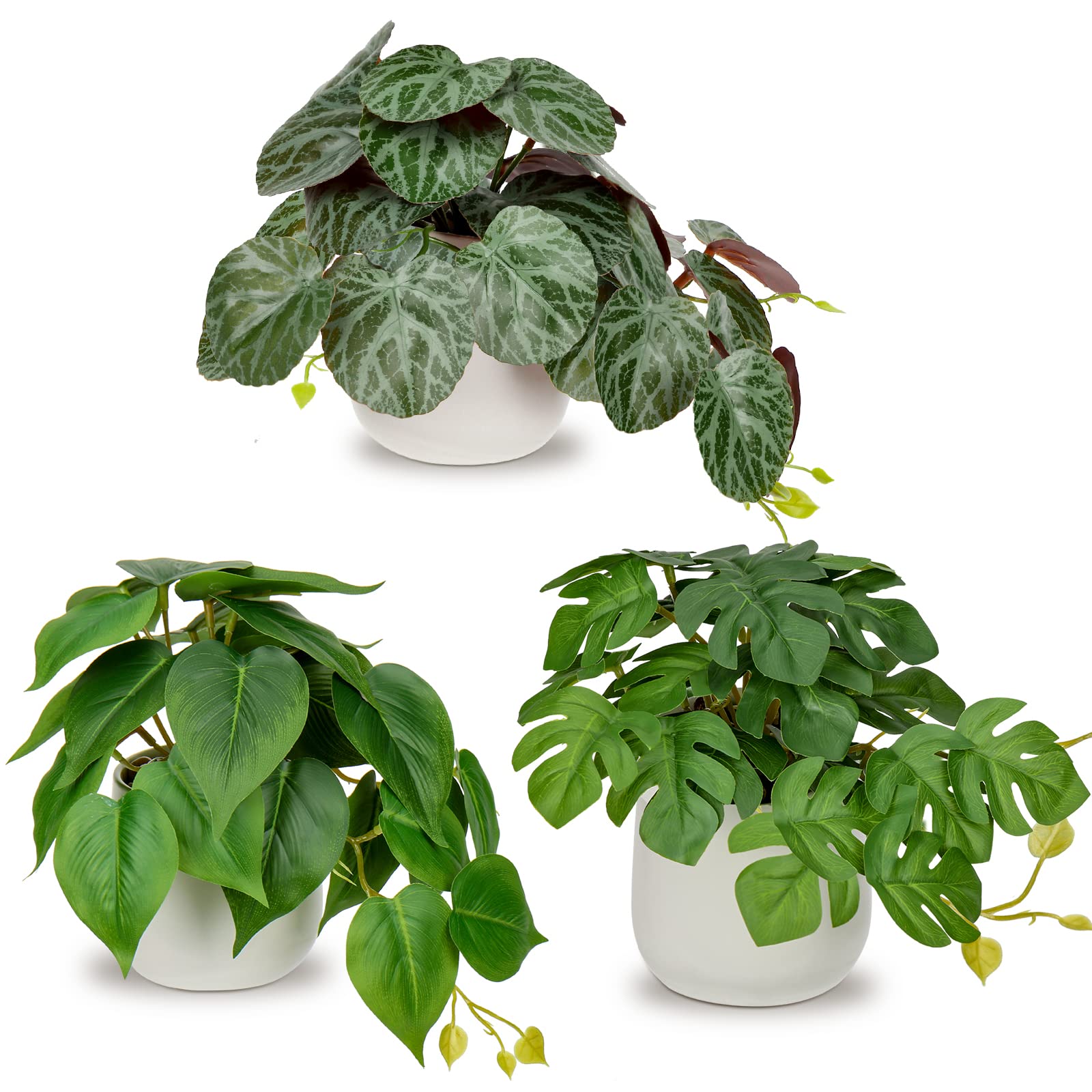 3-piece artificial hanging plant set in ceramic pots. Mini Monstera and Philodendron plants for modern decoration in home, office, bathroom, kitchen, and interior design.
