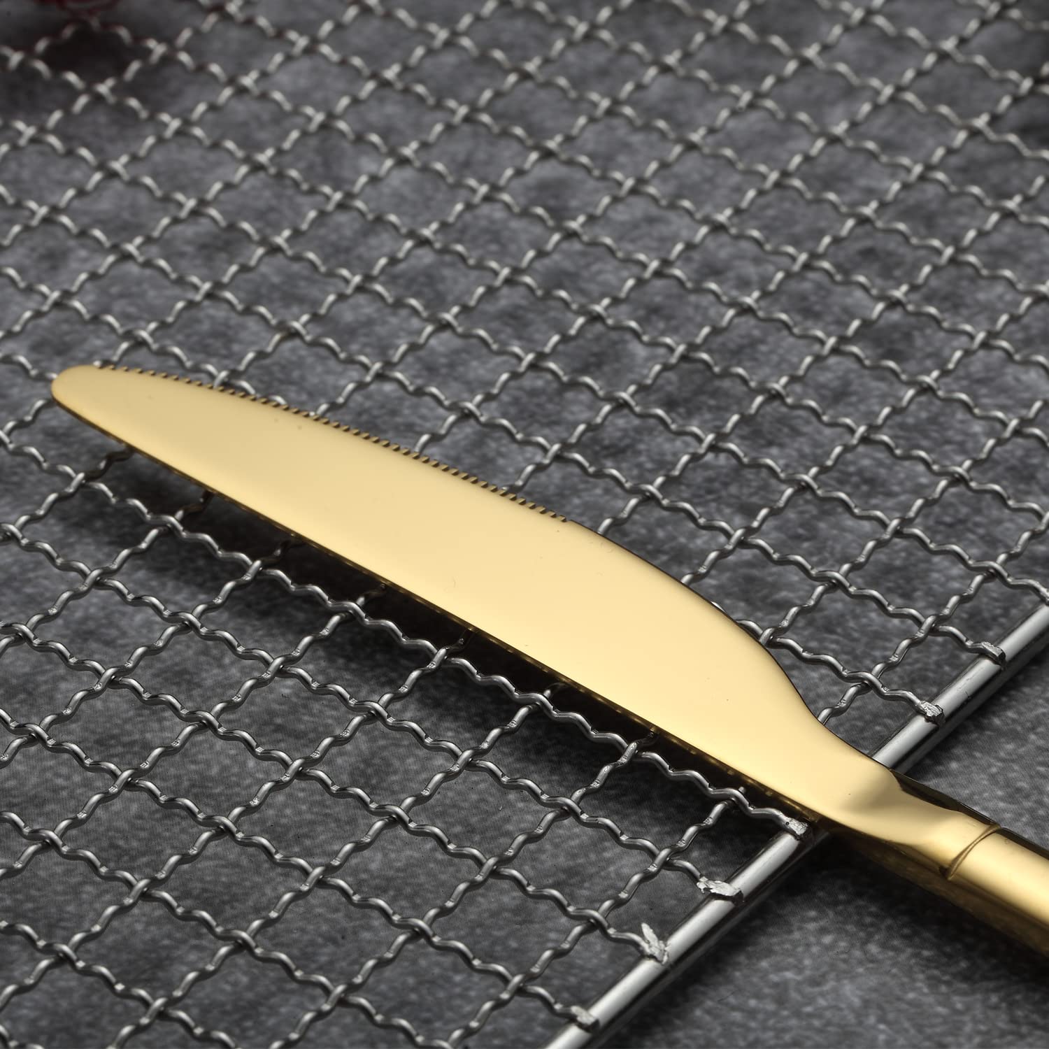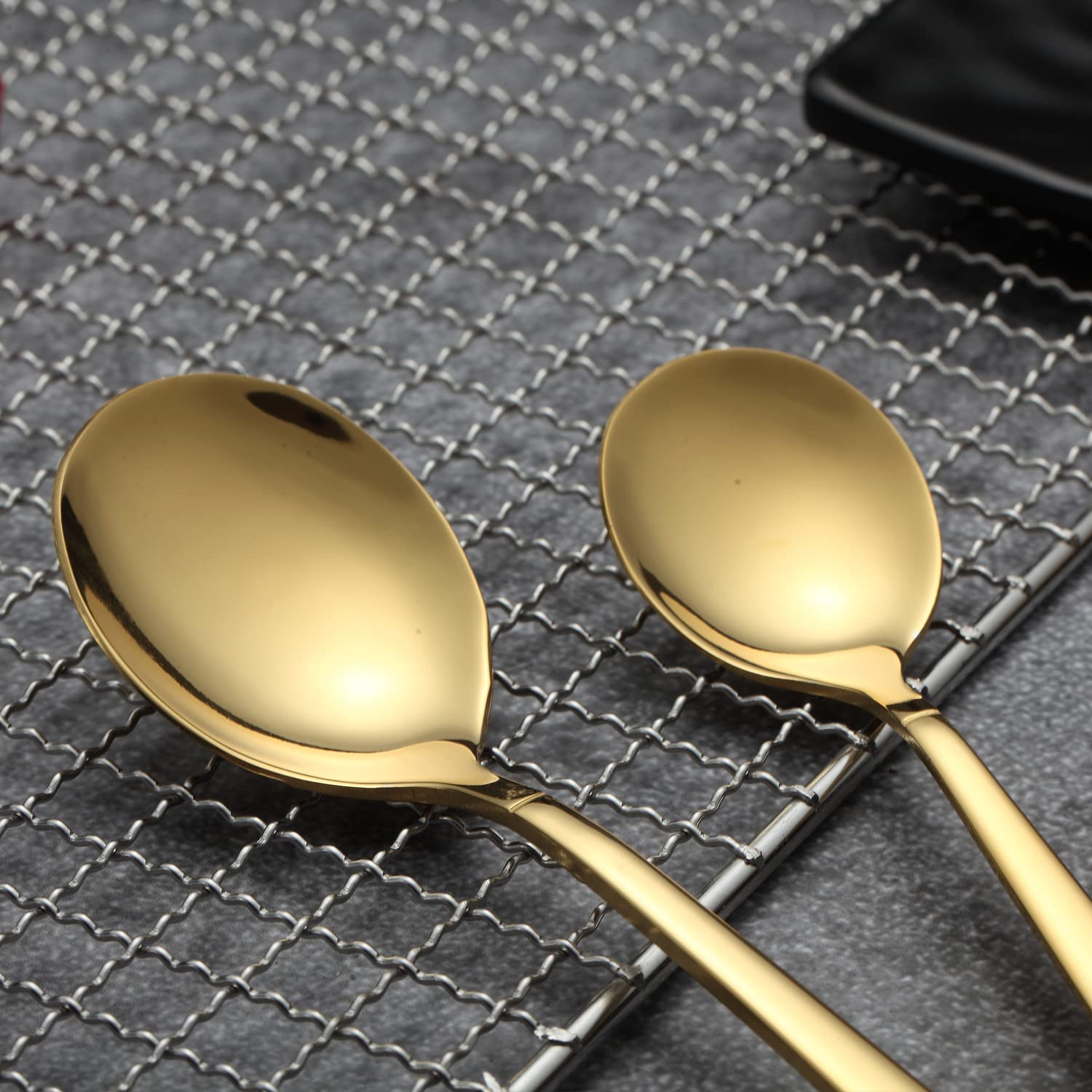 ["The set includes 30 pieces: 6 of each, dinner spoon, dinner fork, dinner knife, teaspoon, tea fork", "Durable stainless steel 18/0 dining set, will not bend; Strong anti-rust, designed for good grip for adults and children. Well balanced to securely fit in your hand. Intricate, perfect curve.", "High-quality titanium gold high-temperature vacuum coated, it increased surface hardness, avoiding scratches on the cutlery when using. Perfect for daily use, holiday dinners, parties, weddings, restaurants, hotels, or other formal occasions.", "Timeless elegant design makes this cutlery suitable for formal occasions or everyday meals.", "Dishwasher safe for quick and easy cleaning of household kitchens."]