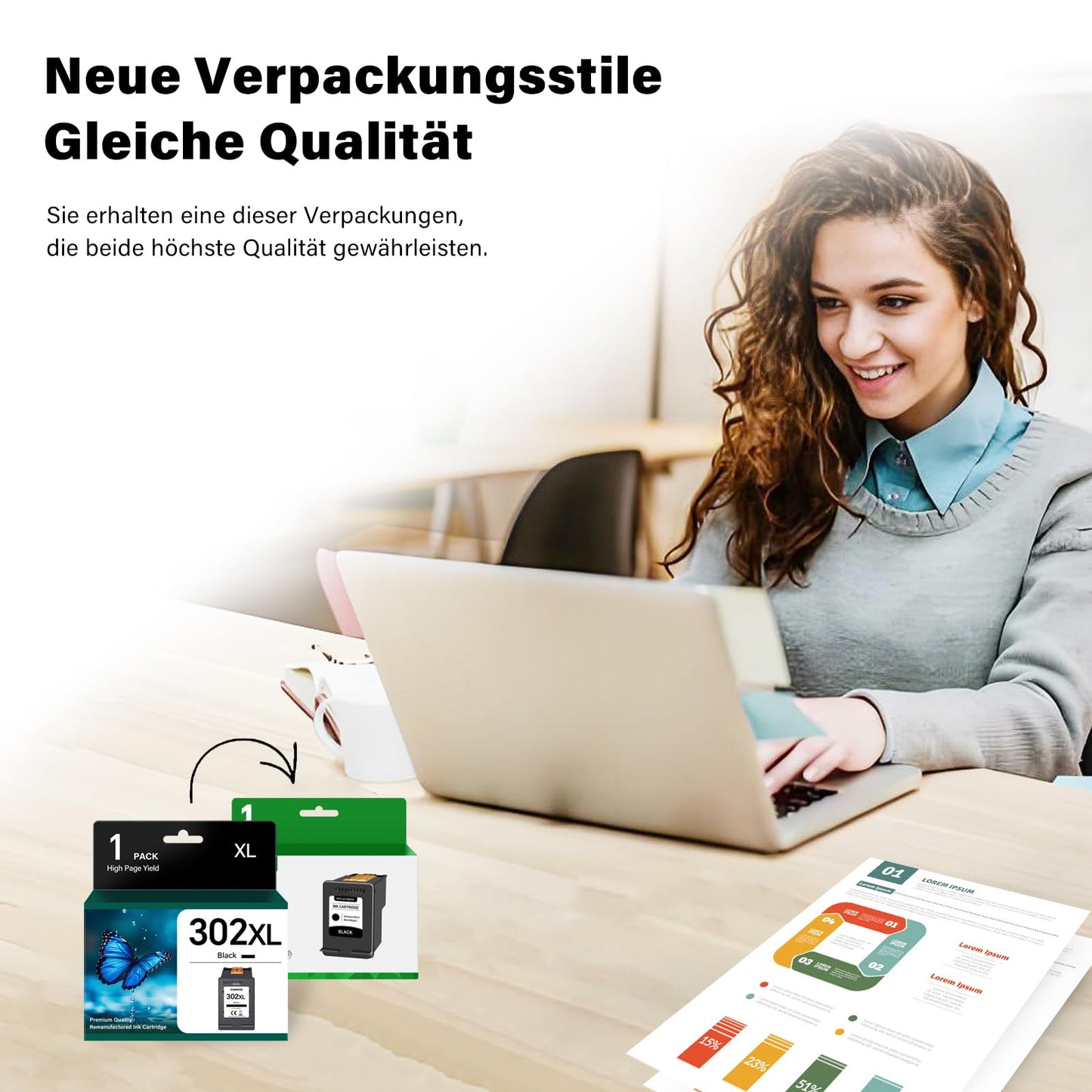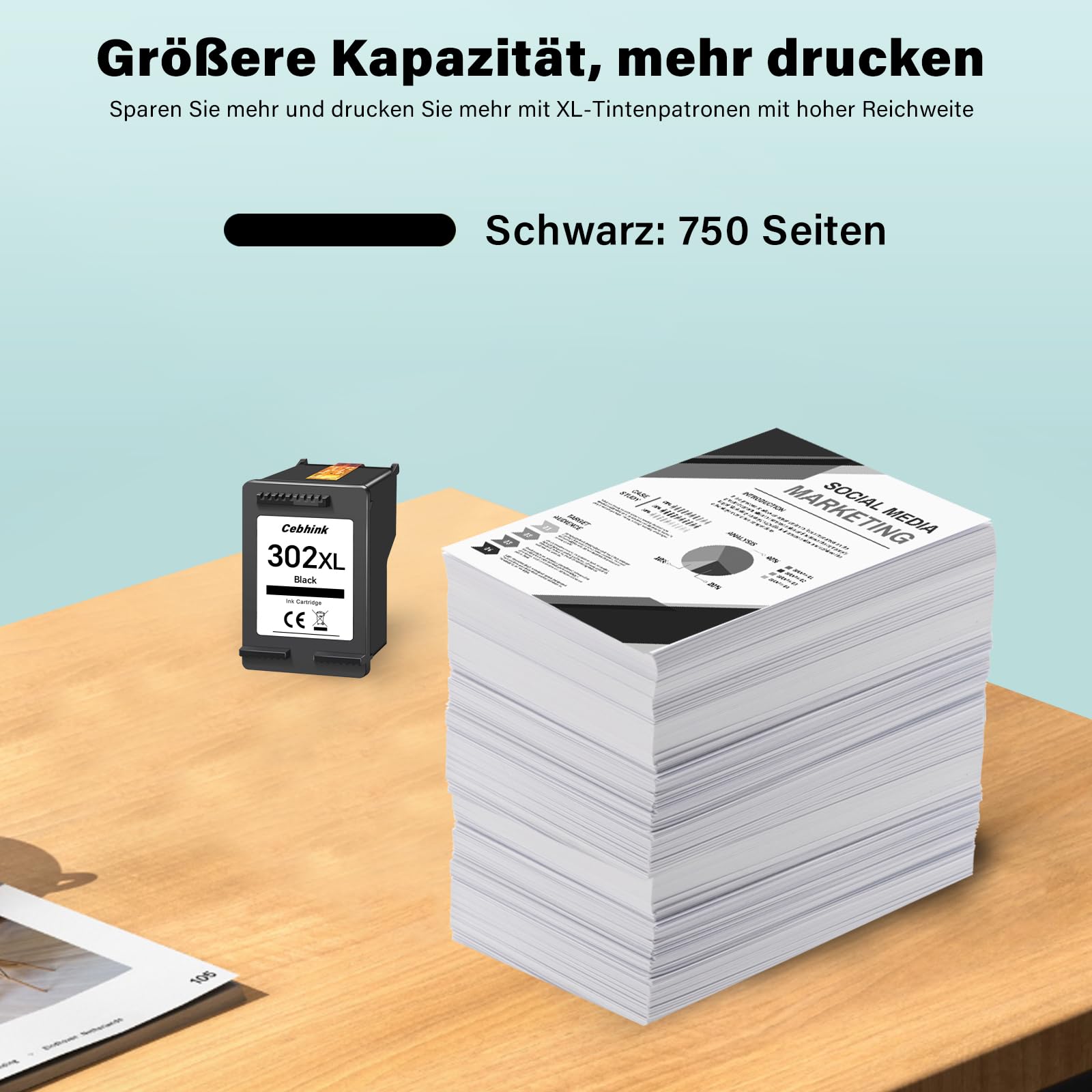 ["HIGH-QUALITY REMANUFACTURING: Professionally remanufactured 302 XL Black Printer Cartridges for HP 302 Black Printer Cartridges; Compatible with 302 for HP Printer Cartridges 302 Guaranteed perfect printing performance for office documents, academic papers, photo prints, and business reports","COMPATIBLE PRINTER MODELS: Printer cartridges for HP 302 Black Printer Cartridges compatible for HP Envy 4520 4521 4522 4523 4524 4525 4526 4527 4528 Deskjet 1110 2130 2132 2134 3630 3632 3633 3634 3635 3636 3637 3639 Officejet 3830 3831 3832 3833 3834 3835 4650 4652 4654 4655 4658 5200 5220 5230 5232; Easy 3-step installation - Plug and Play","HIGH PAGE YIELD: 302 for HP 302 printer cartridges offer 750 pages with 302 XL Black on 5% of A4 size; Economic XL version saves up to 30% and do not need to be changed as often","HIGH-QUALITY INK TECHNOLOGY: Cebhink Instant drying ink for flawless photos & graphics reliably prevents clogging of printheads; Printer cartridges for HP 302 Black Printer Cartridges delivers razor-sharp text documents with professional font smoothing","Scope of delivery: One 1x 302 XL Black Printer Cartridges for HP 302 Printer Cartridges, We are currently updating our packaging design as part of our sustainability initiative; Despite the switch between old and new packaging, the quality of the product, performance, and service remains the same"]