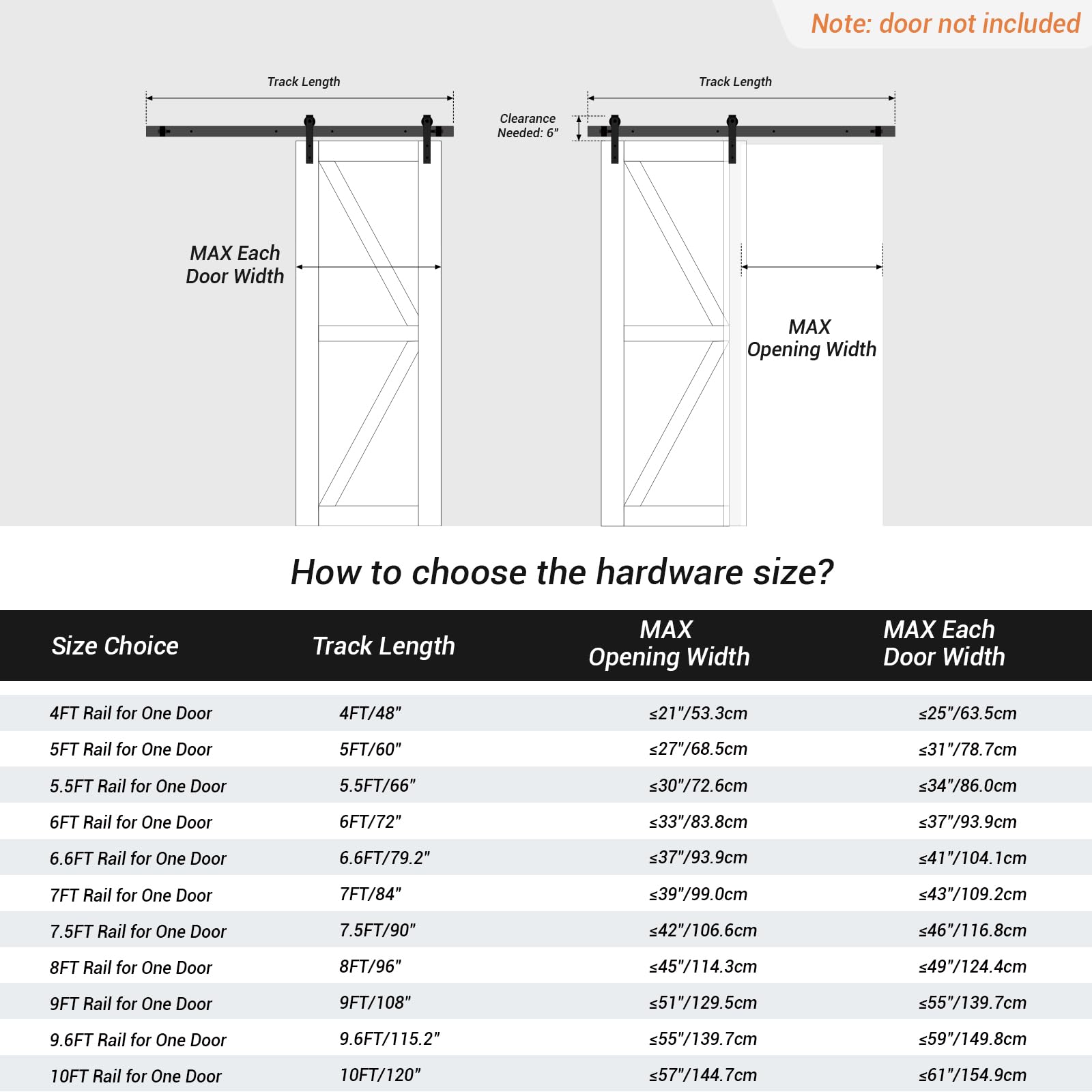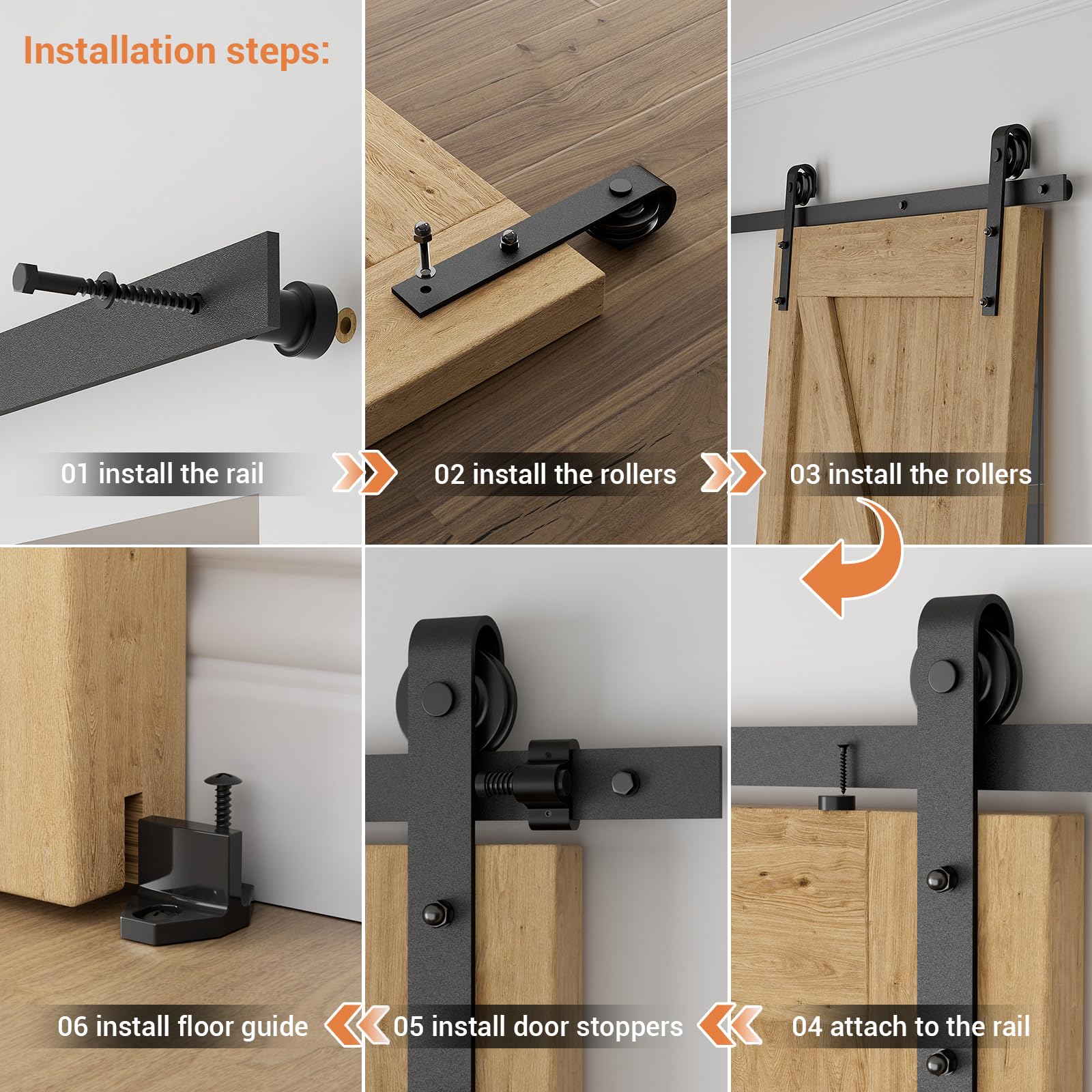 ["Sliding Door Hardware Kit 10 ft (suitable maximum door width is 5 ft)", "Material: Carbon Steel, Color: Black, Warranty: 5 years, Hardware only door not included", "Suitable for door thickness: approx. 1.2 in - 2 in, maximum weight capacity: 220 lbs per door", "Advantage: ① Spring door stopper, reduce noise and extend lifespan. ② Pre-drilled tracks, steel bearings ③ New design junction plate, connect tracks smoothly", "Stylish design, suitable for bedroom, study, living room, kitchen, closet, farmhouse, etc."]
