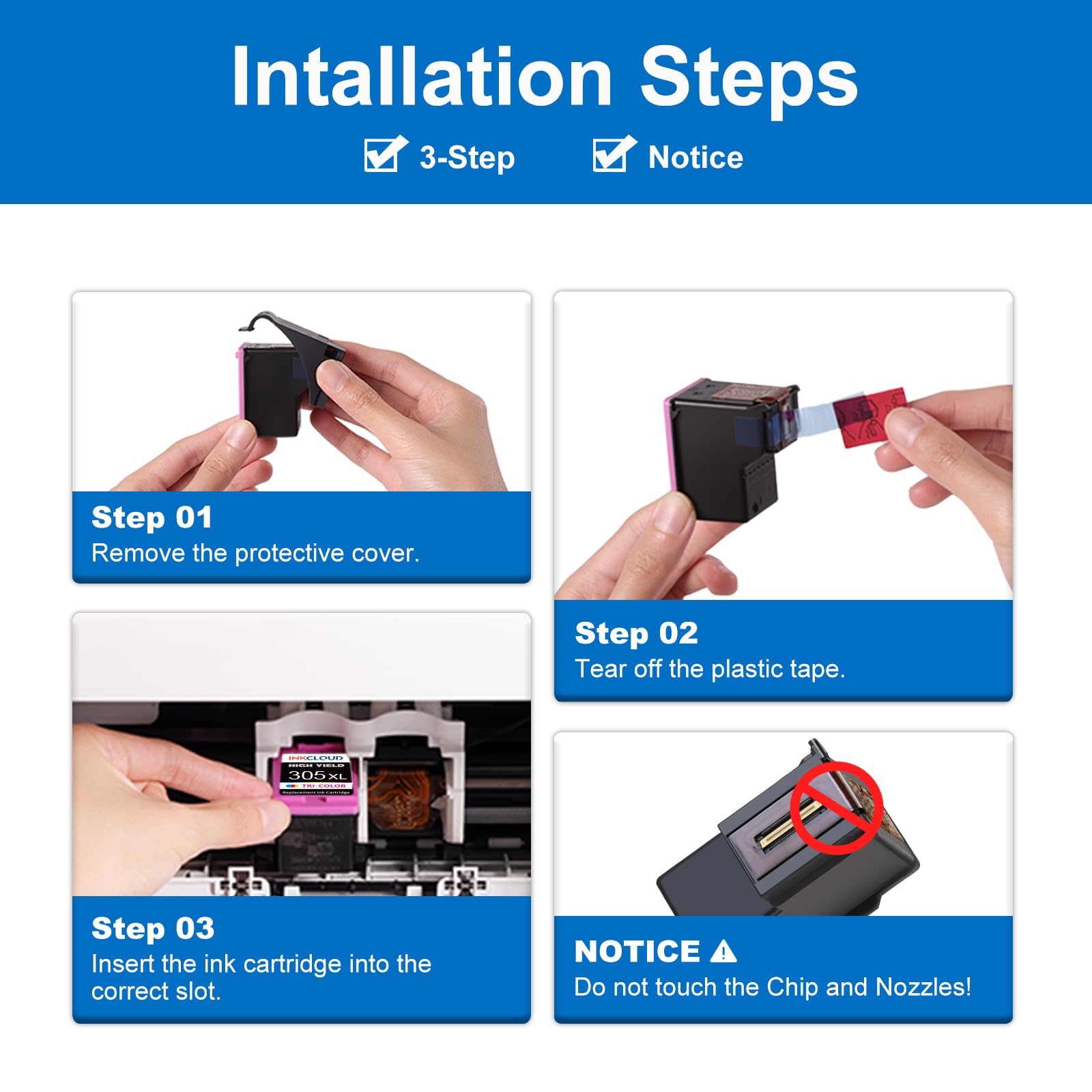 ["⚠️【VERY IMPORTANT TIP】The printer has released a new firmware update 🌈“2510AR” via Wi-Fi. Updating the firmware may cause the 🌈41**/42**/27**/28** series printers to 🌈fail to recognize the ink cartridge chip🌈. We recommend disabling the automatic firmware update feature on the printer and avoiding manual firmware updates from the official website to minimize the risk of firmware-related issues. If you encounter issues with the printer series failing to recognize ink cartridges, please contact us immediately.","【Product】INKCLOUD Replacement for HP 305 305XL Ink Cartridges Multipack Set Black and Color (With Chip | Not Original)","【High Page Yield】600+ pages per 305XL Black, 450+ pages per 305XL Color (at 5% coverage of A4), Yield varies significantly due to print images, settings, and temperatures","【Professional Printing Quality】Brightness and color saturation, uniform printing, no smudging, true-to-life patterns on paper, meets all your daily printing needs","【Advanced Chip Technology】All replacement for HP 305 XL Cartridges Set are equipped with the latest updated chips and are rigorously tested and tested to ensure excellent compatibility and print performance","【Compatible for HP Printers】Ink Cartridges 305XL Perfectly Compatible for DeskJet 2820e 1210 1212 1215 1255 2300 2330 2332 2700 2710 2710e 2720 2720e 2721 2721e 2722 2722e 2723 2723e 2724 2732 2742e 2752 2752e 2755e 2820 2821 2821e; Deskjet Plus 4110 4110e 4120 4120e 4121 4122 4122e 4130 4140 4152 4155 4155e 4158 4158e 4200 4220 4220e 4255e printer","There is an old and a new version of the product packaging, but the quality is identical. You can use the product with confidence"]