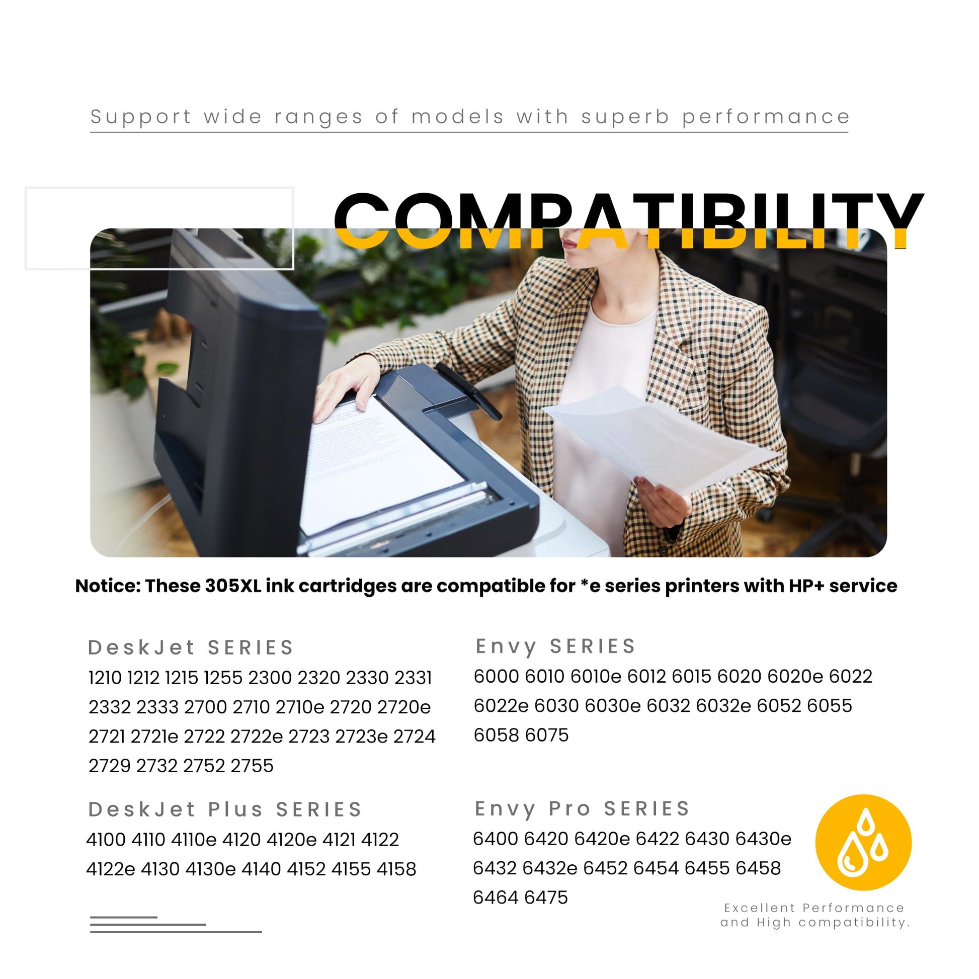 ["Product Name 305XL Printer Cartridges 305 Replacement for HP 305 Printer Cartridges for printer cartridges hp 305. (Print more, spend less)", "Package Contents Printer Cartridges 305 XL Compatible with 305 hp printer cartridges. (1 x 305XL black, 1 x 305XL color, 1 x cleaning rubber, 1 x user manual, Note: Packaging may vary depending on version, quality remains the same)", "Compatible Models 305 XL printer cartridges Compatible for Printers of the *e Series with HP+ Service, Compatible for hp deskjet 2820e cartridges DeskJet 2700 2710 2710e 2720 2720e 2721 2722 2723 2723e 2724 2725 2800e 2810e 2820e; DeskJet Plus 4100 4110 4110e 4120 4120e 4121 4122 4122e 4130 4130e 4200 4220 4220e Envy 6000 6010 6020 6022 6022e 6030 6030e 6032 6032e; for Envy Pro 6400 6420 6422 6430 6430e 6432 6432e *More printer models can be found on the detail page", "High Page Yield 305 XL Printer Cartridges Compatible for hp printer cartridges 305, 750 pages for 305 XL black for hp 305 black, 450 pages for 305 XL color, (A4 paper, 5% coverage). With cost-effective and high-quality recycled cartridges, we provide seamless printing solutions for the home office, enabling not only excellent color production and long life but also helping you save costs and reduce waste", "Exceptional Quality 305XL printer cartridges Tests according to the highest quality standards ensure sharp and clear text and vibrant images to provide you with a whole new printing experience. Each printer cartridge 305XL went through 11 strictly controlled production stages and was certified according to ISO 45001, ISO14001, and ISO9001"]