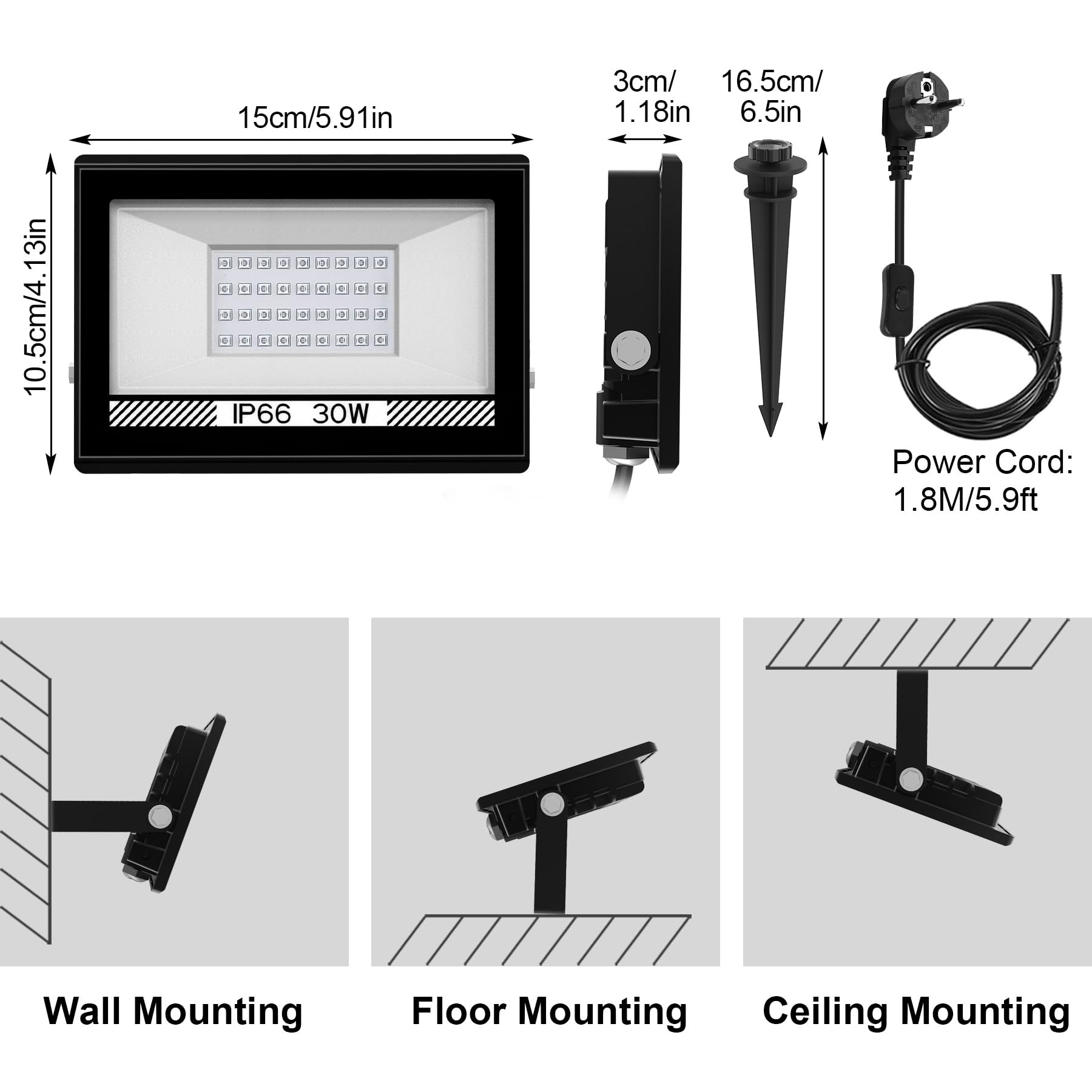 "【IP66 Waterproof Floodlight】With IP66 waterproof and rustproof rating and surface treated with high-quality electrostatic adsorption, it ensures that the light works properly in rain, snow, heat, or cold and provides stable and bright light for gardens, yards, villas, parks, garages, pools, roofs, buildings, streets, roads, etc.",
