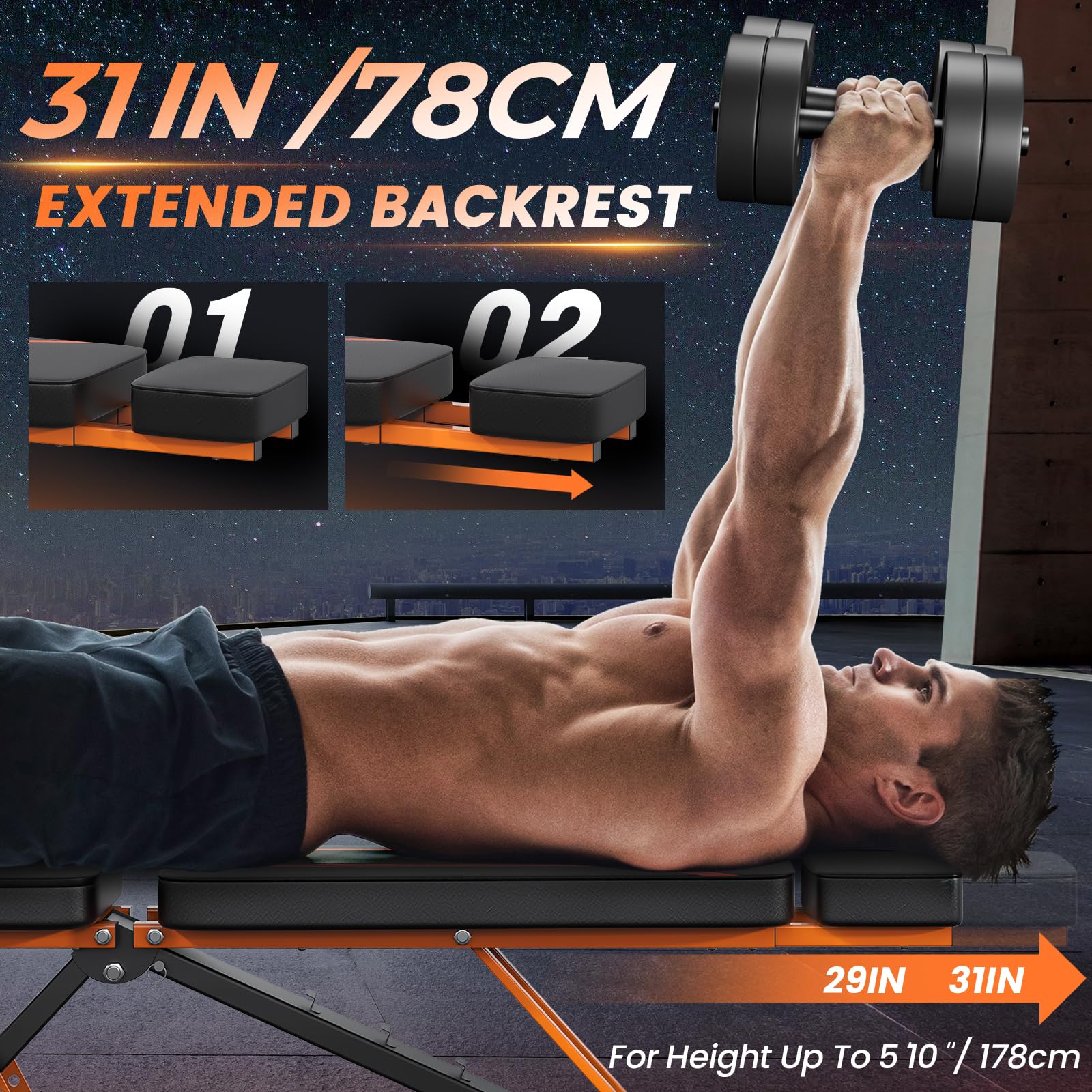 ["Heavy-Duty Steel Frame for Commercial Use】This dumbbell bench is made of a commercial-grade square steel frame and 1.6mm thick tube walls that provide stability and can withstand high-intensity training sessions. It has a weight capacity of 350 kg, ensuring a safe fitness experience without worrying about instability.","【No Wobbling】This workout bench is equipped with a 52 cm long stabilizer and reinforced bolts to ensure sturdy stability and prevent any wobbling or lateral movements during training. The rear transport wheels and handle make it easy to move and store.","【Covering All Heights (180cm)】The foldable dumbbell bench has a backrest length of 78 cm, suitable for users of different heights up to 180 cm. Additionally, the 32 cm wide backrest provides strong support for the back and waist, increasing comfort and efficiency in bench press exercises for individuals with different body types.","【Ultimate Comfort Experience】The training bench features a 5 cm thick seat cushion and high-quality foam, providing a sense of security and lightness similar to that of a comfortable mattress while reducing muscle fatigue during full-body workouts. It is ideal for longer periods of sitting or training various muscle groups such as chest, shoulders, back, and abdominal muscles.","【100% SATISFACTION GUARANTEE】BONVORK offers its customers a 365-day warranty and professional customer service. All inquiries will be answered within 24 hours. Our mission is to provide every customer with high-quality products and excellent service."]