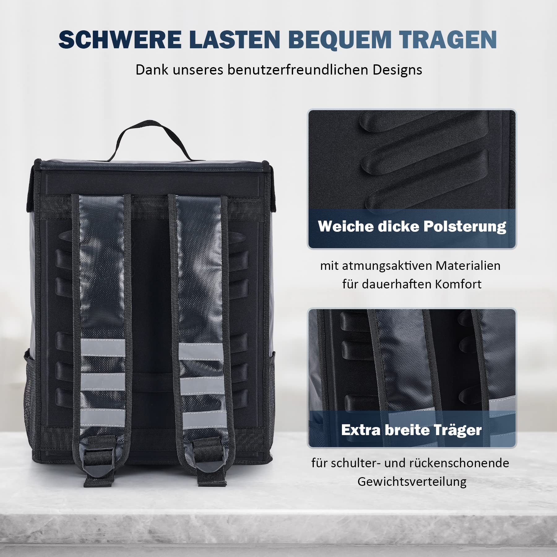 "Waterproof Construction - Our waterproof cooler backpack made of 500D PVC fabric is waterproof and protects your orders from spills and heavy rain.",